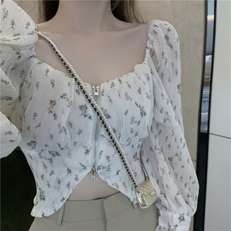 スリーブフローラルシフォンショートシャツ 薄手カジュアルパンツ 花柄 オフショルダー シルク Xiaofeijia52529625788