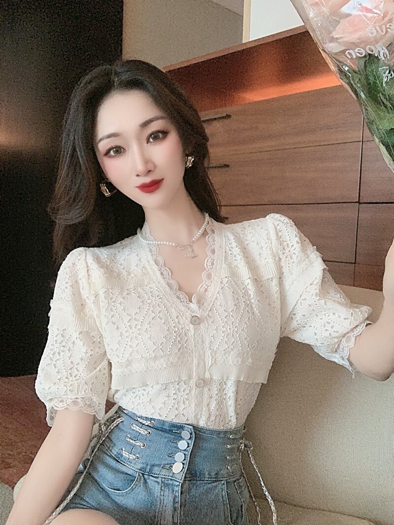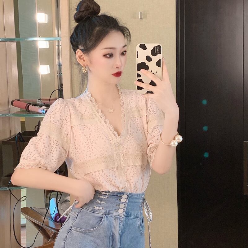 Vネックスリーブシャツ レースサマー 夏物 Xiaofeijia80406635074