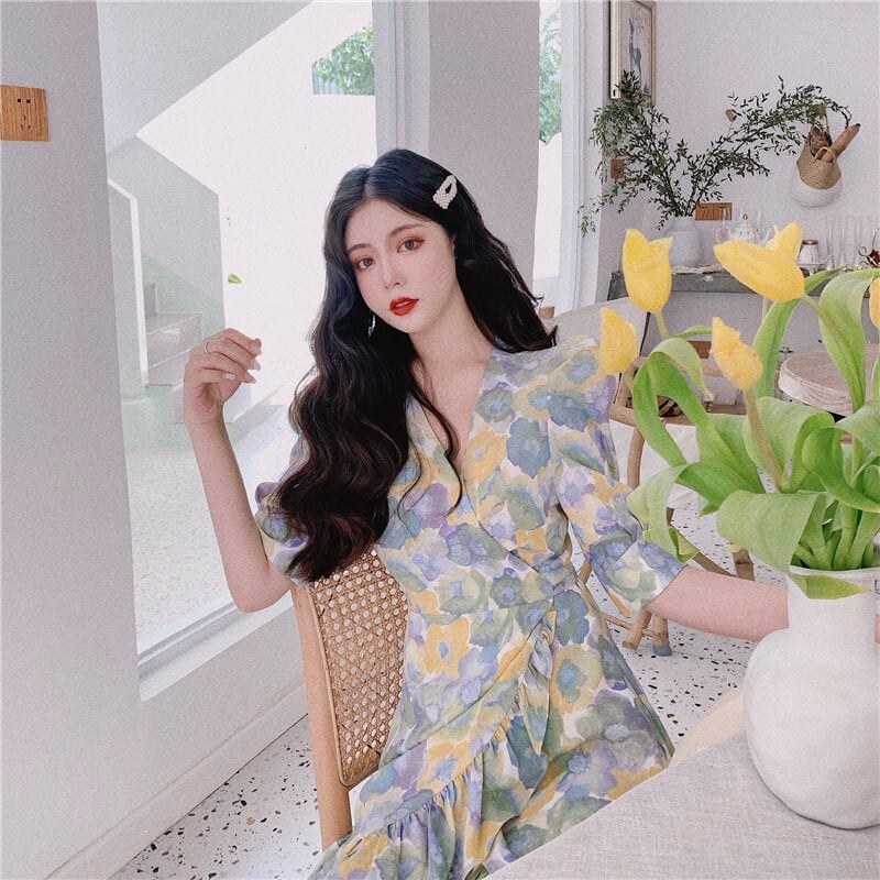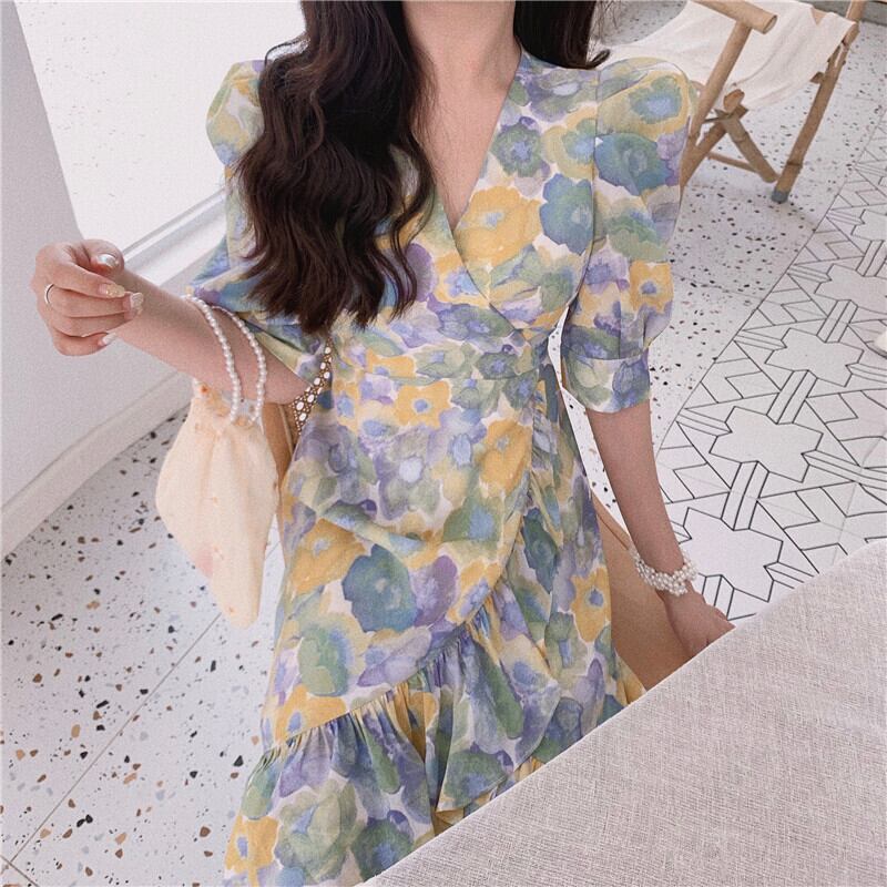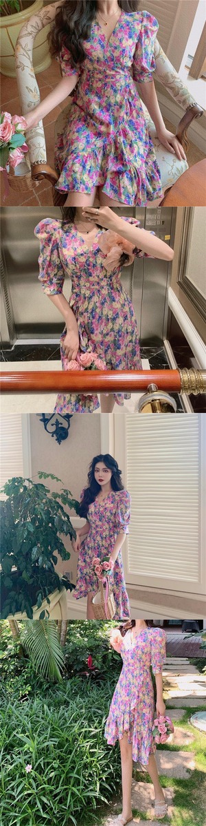 サマースタンダードスタイルフローラルドレス ワンピースウェストスカート レトロ 夏物 花柄 Xiaofeijia18308984559