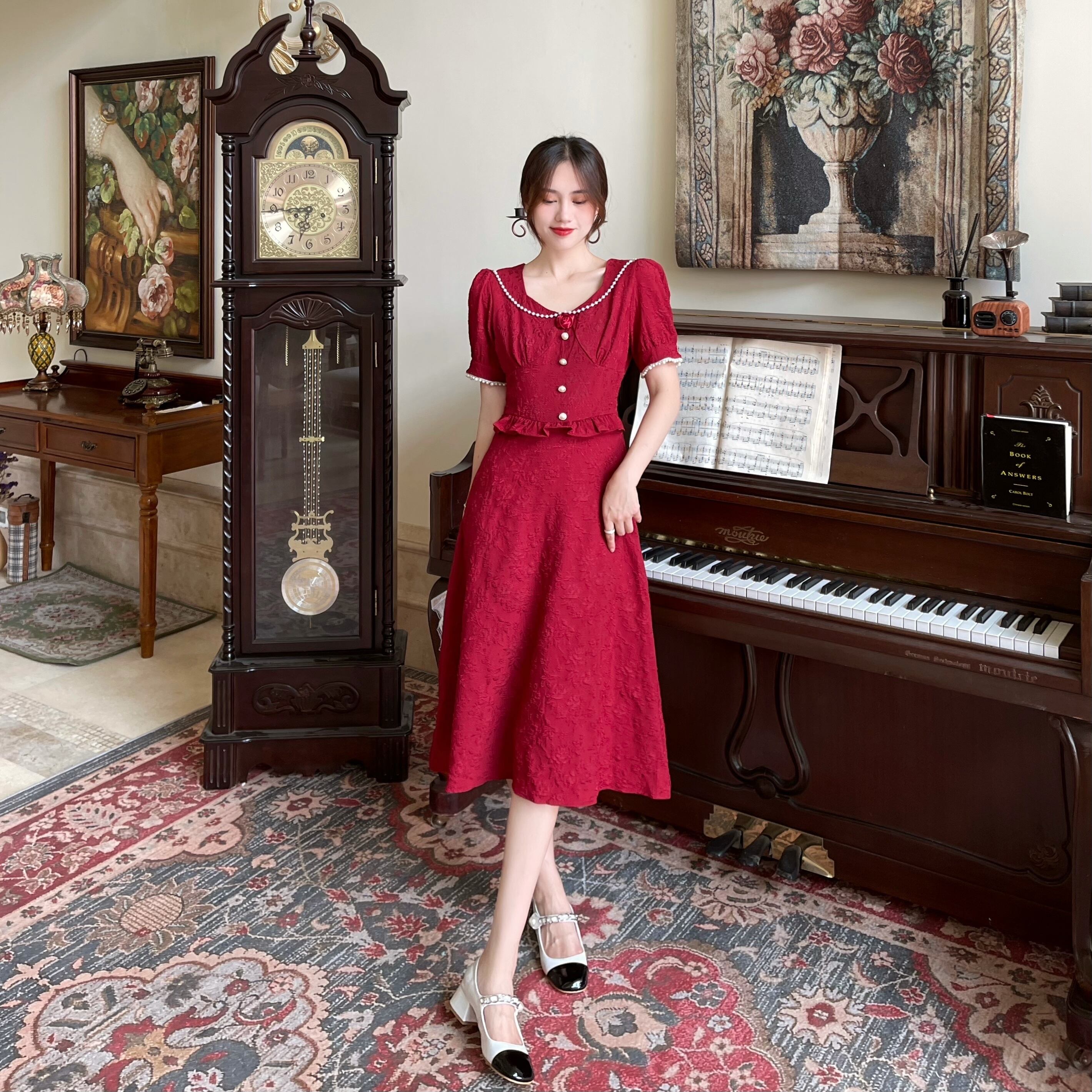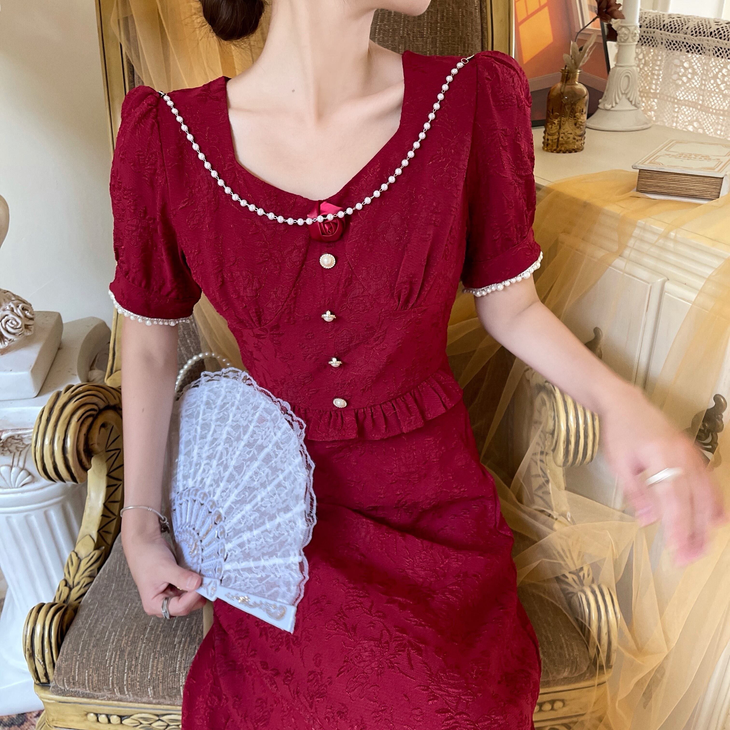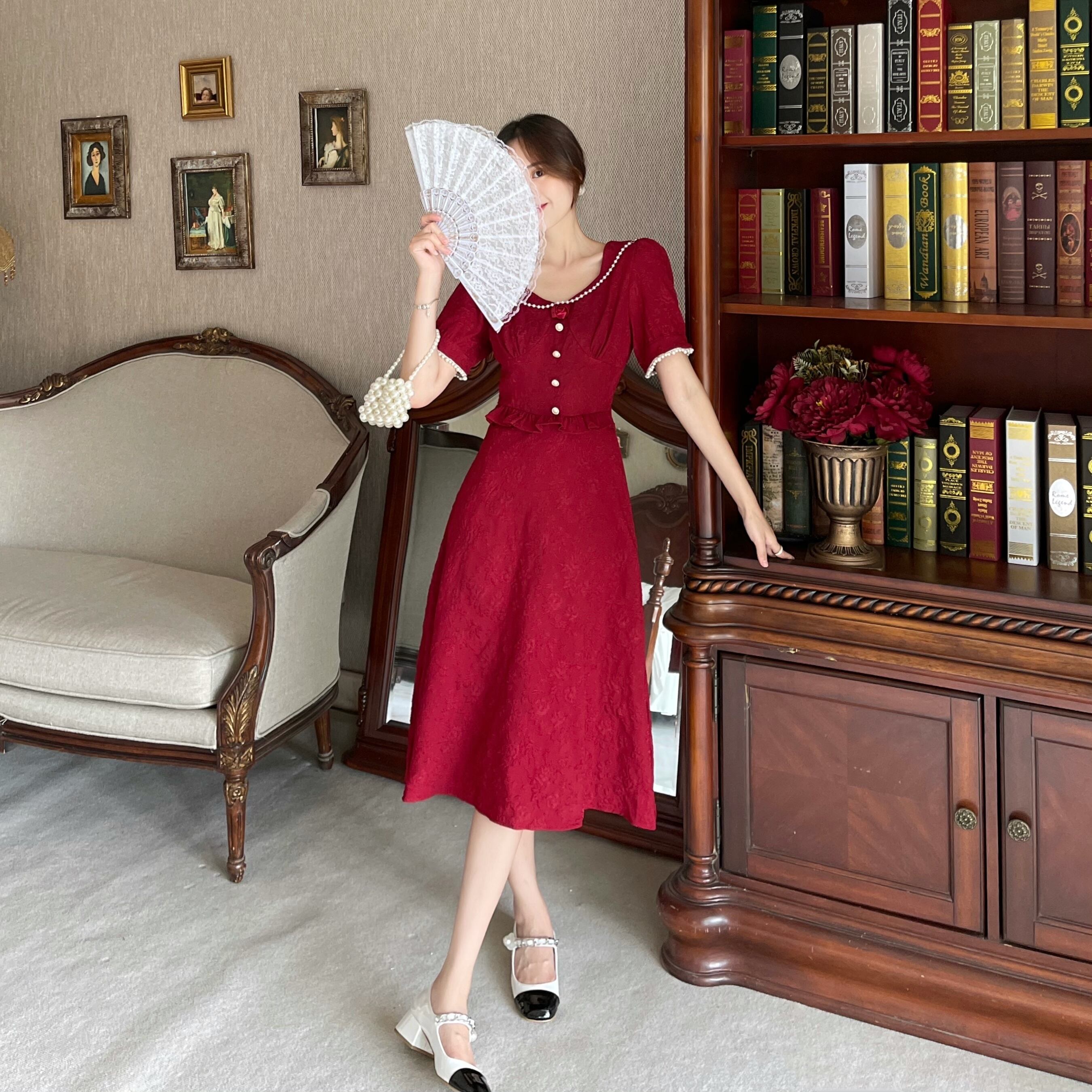 スタンダードレッドドレス ホワイトジャカードスカート サマーVネックロング レトロ 夏物 Xiaofeijia95795732517