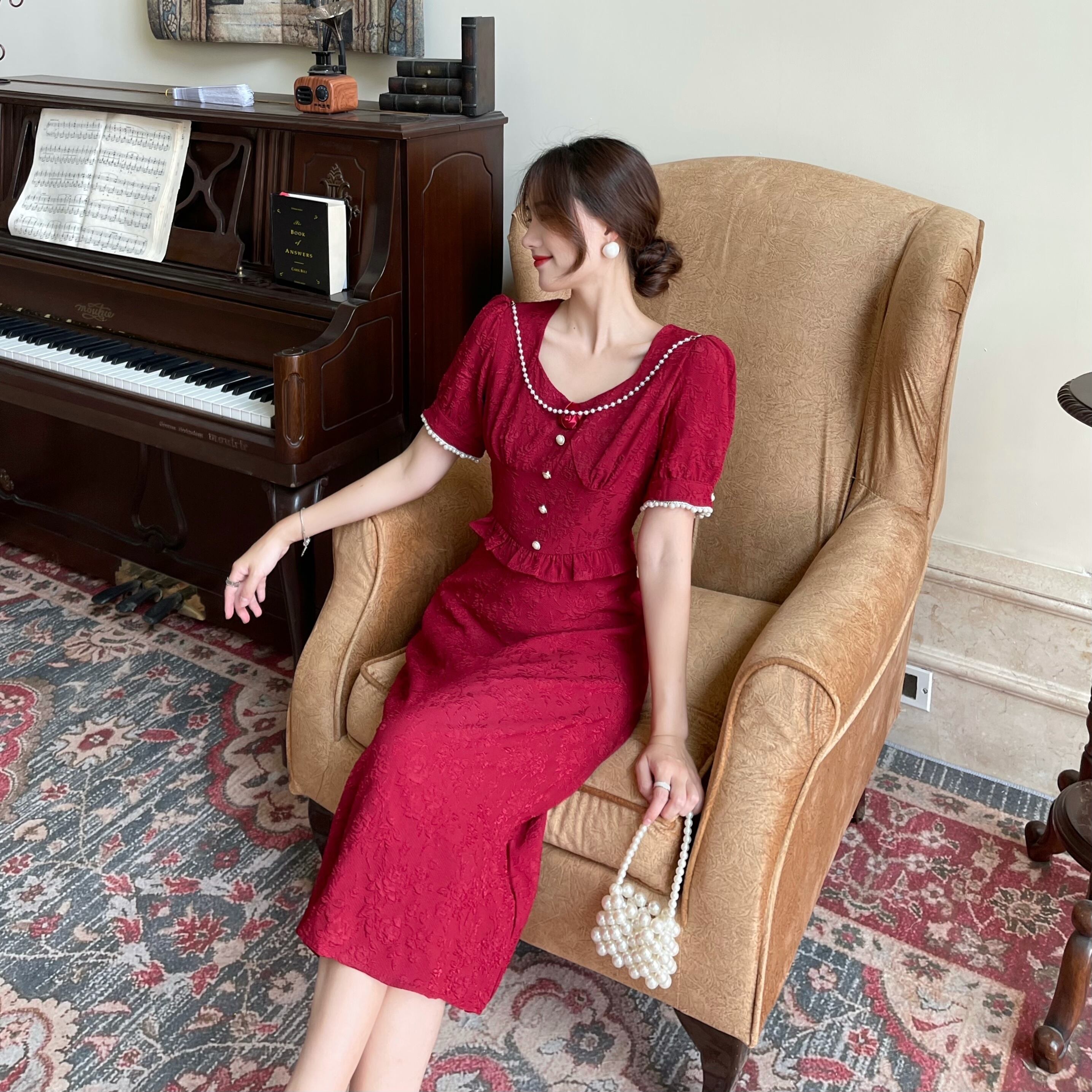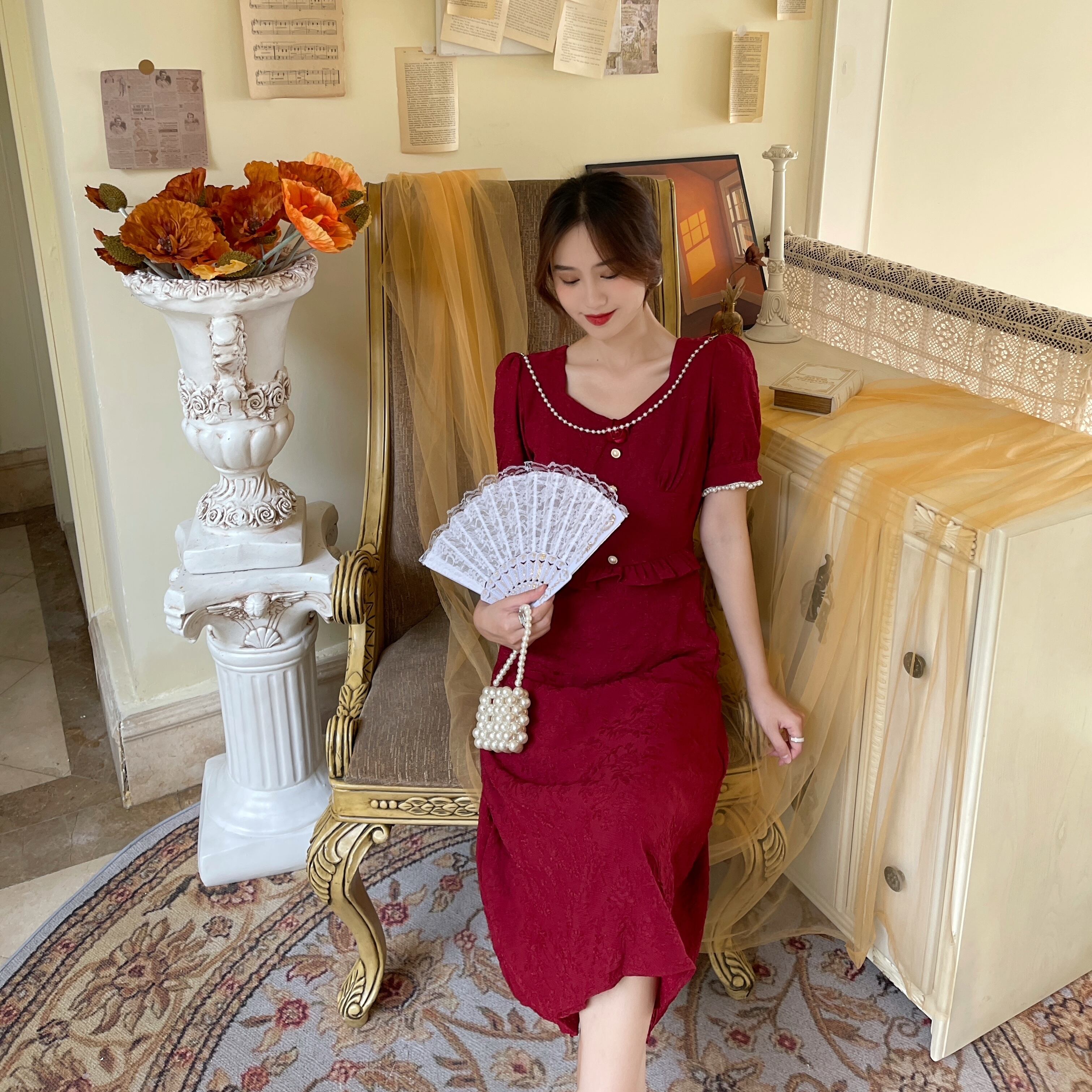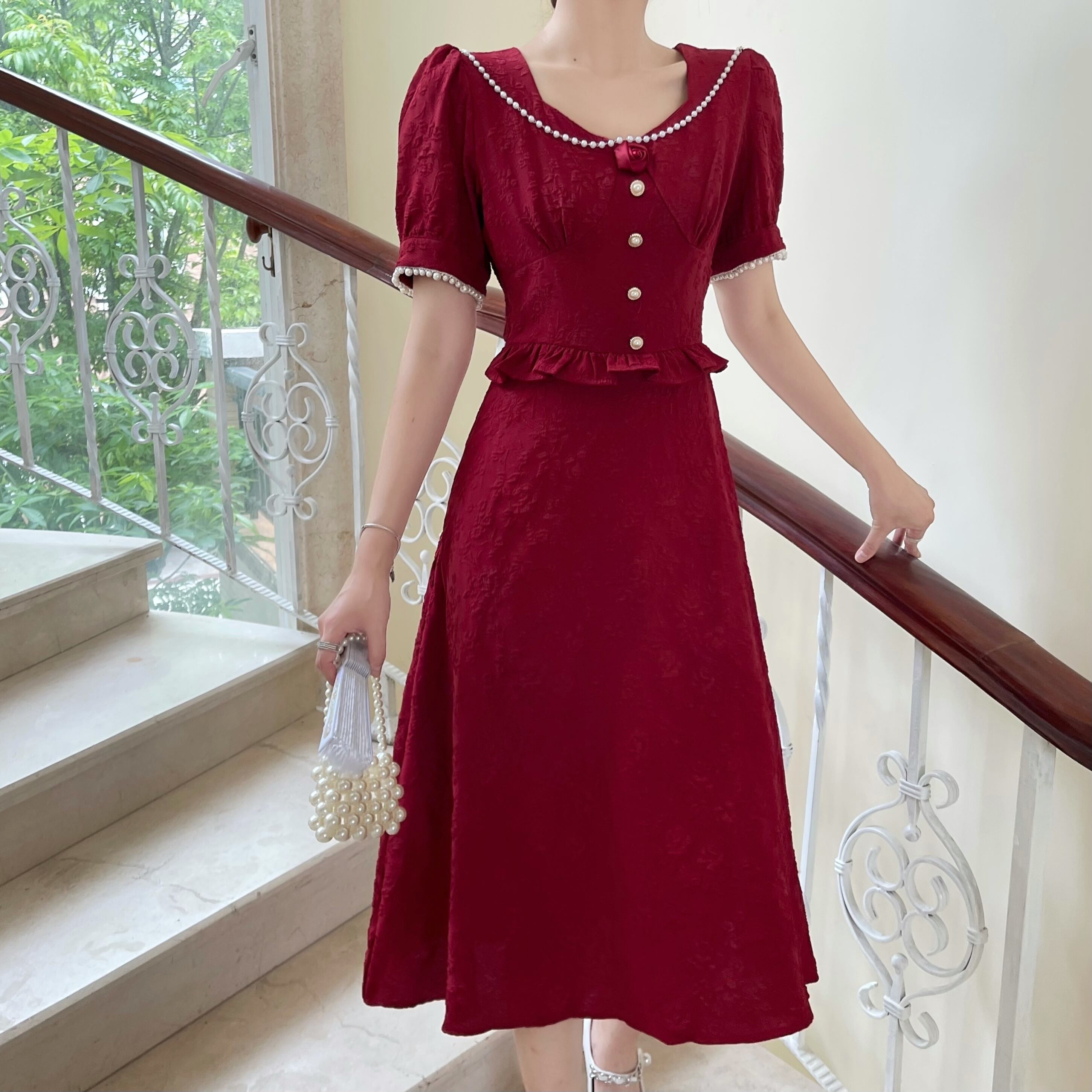スタンダードレッドドレス ホワイトジャカードスカート サマーVネックロング レトロ 夏物 Xiaofeijia95795732517