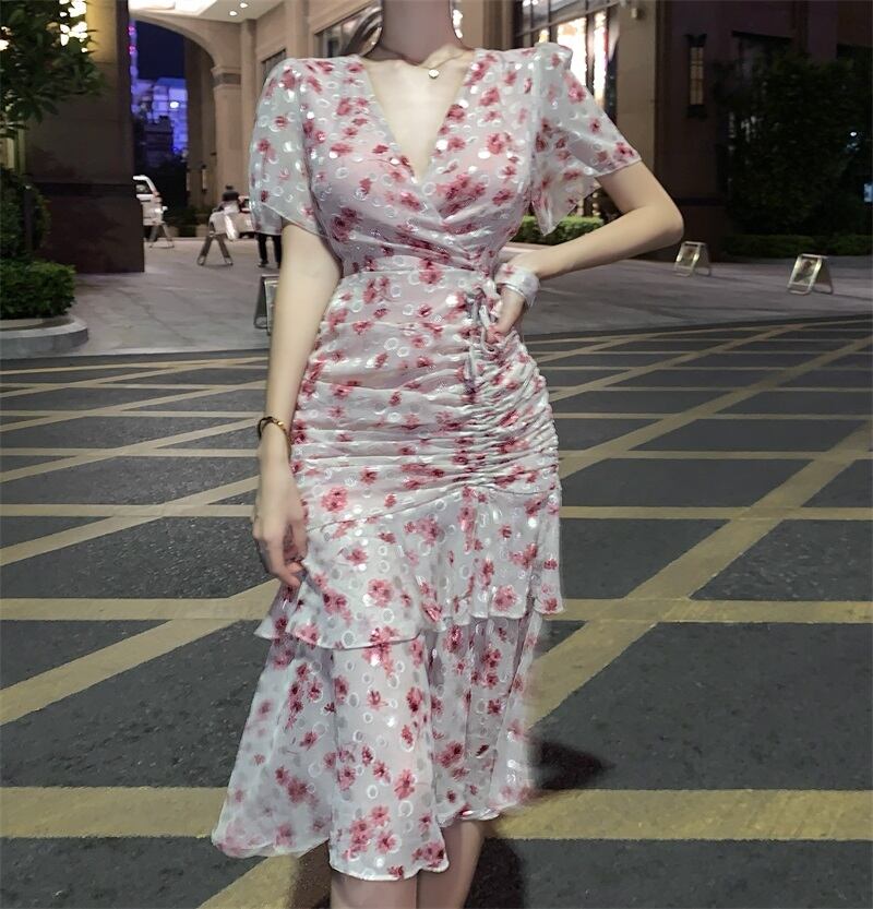 フローラルスカート ギャザーウェストプリーツシフォンドレス 花柄 Xiaofeijia17123361451