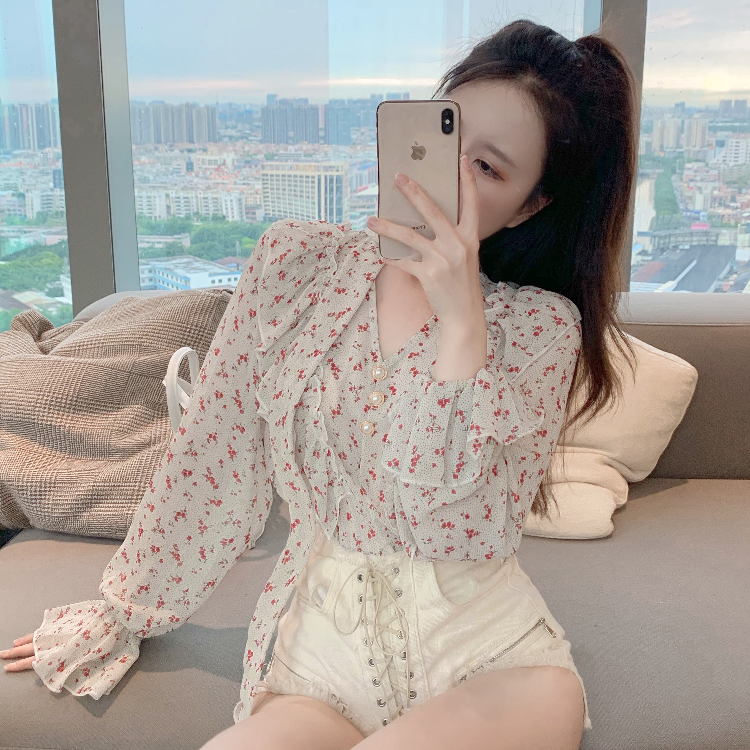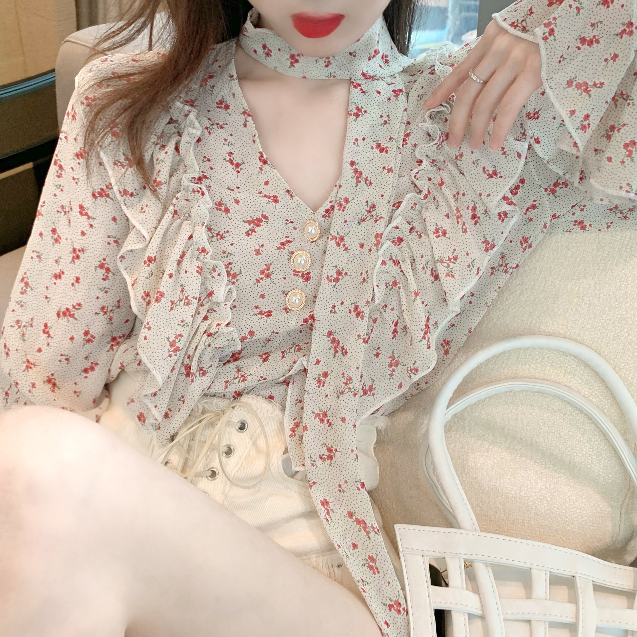 スプリングスタンダードVネックフローラルシフォンシャツ ルーズトップス ロング レトロ 春物 花柄 Xiaofeijia7037567254