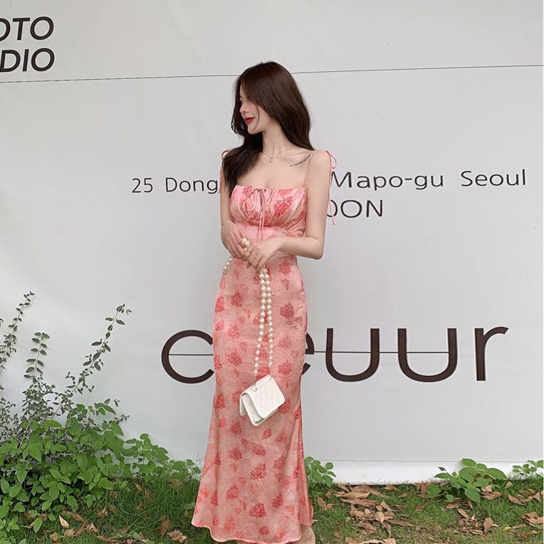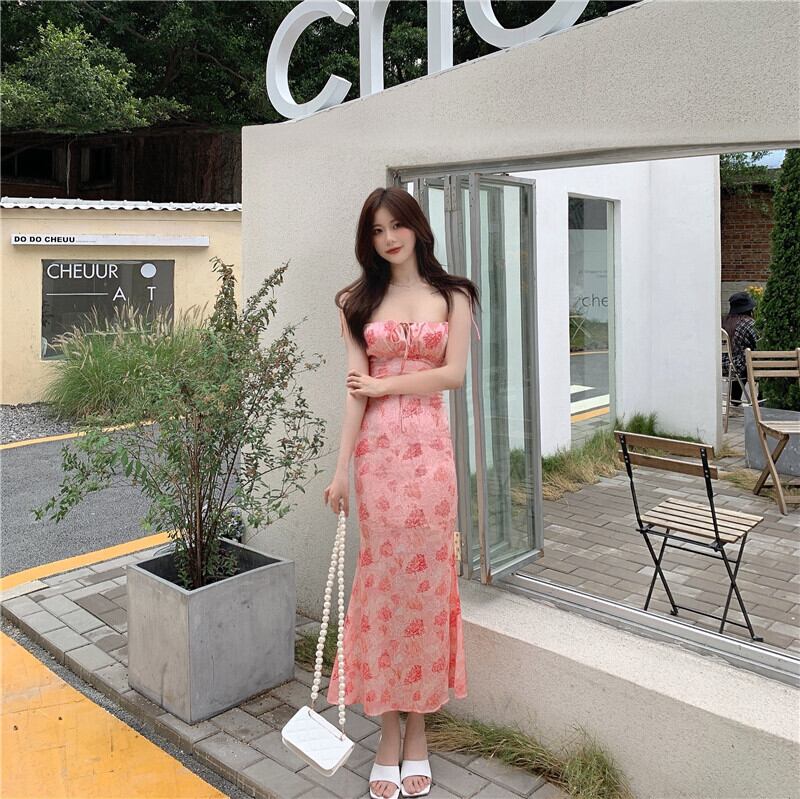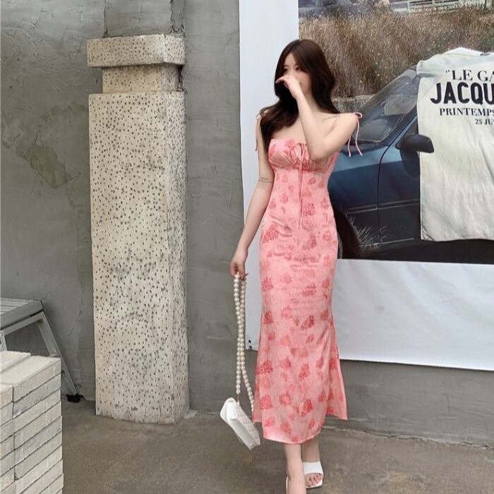 フローラルハイウェストウェストドレス ピンク 花柄 Xiaofeijia57360900040