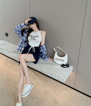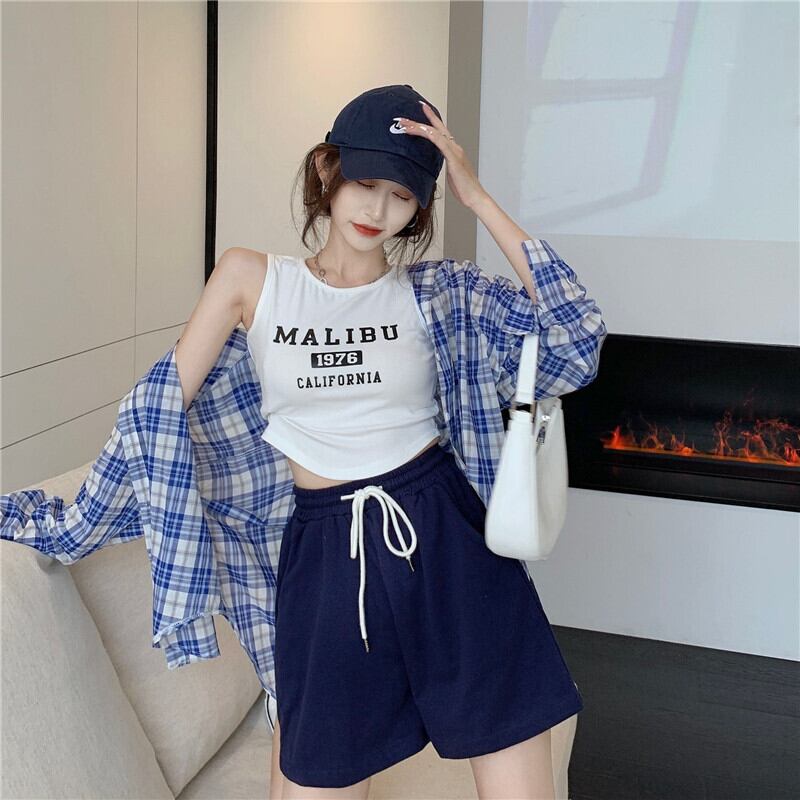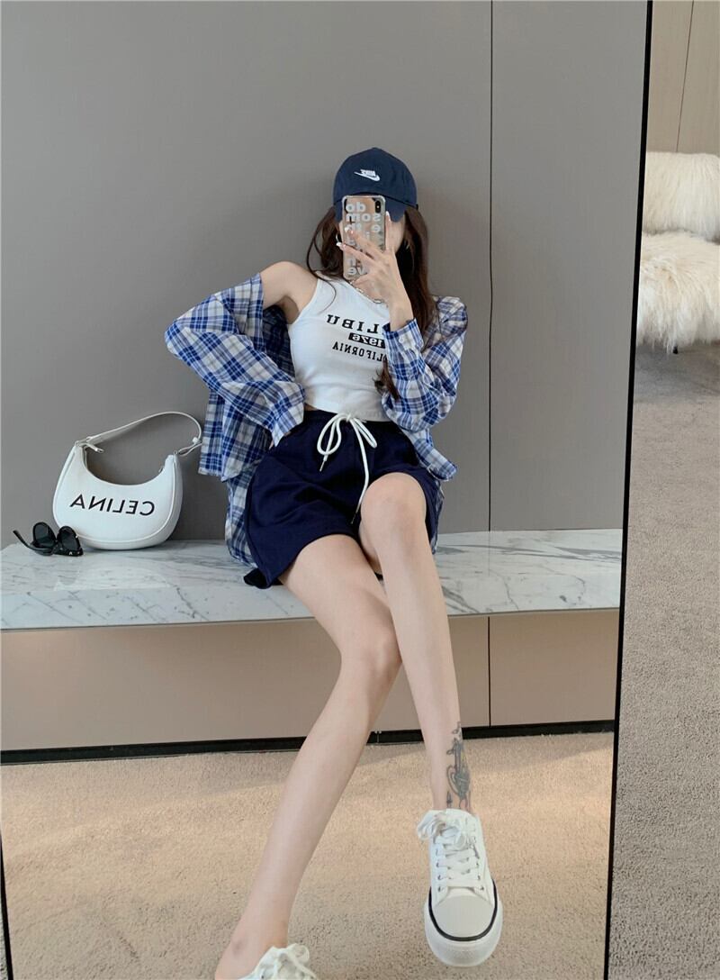 レッドサマーストレッチウェストカジュアルショーツ 格子柄シャツ ストリート エラスティック 伸縮 夏物 ブルマー Xiaofeijia92243030522