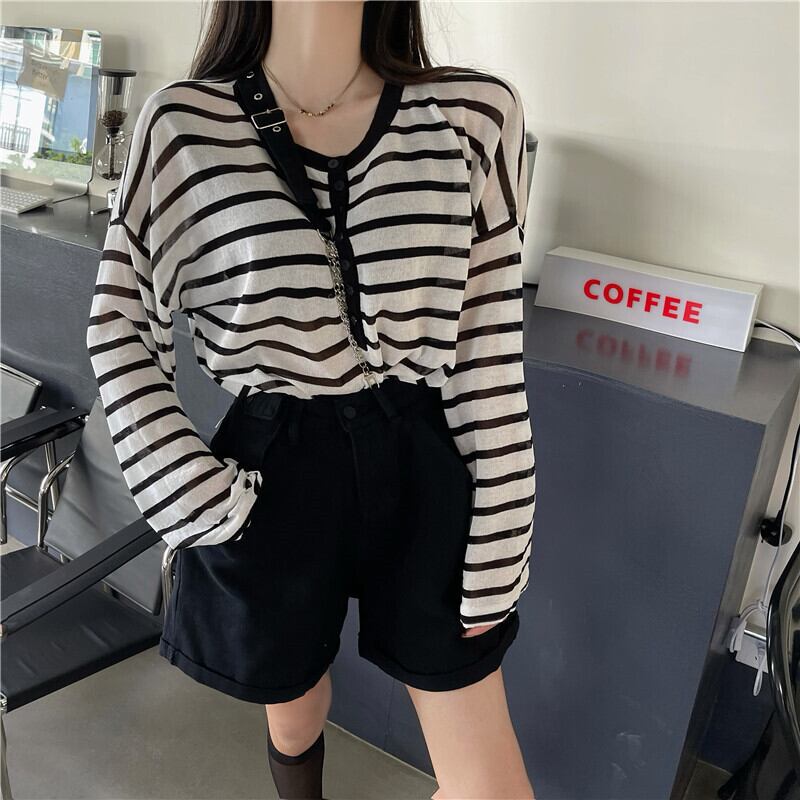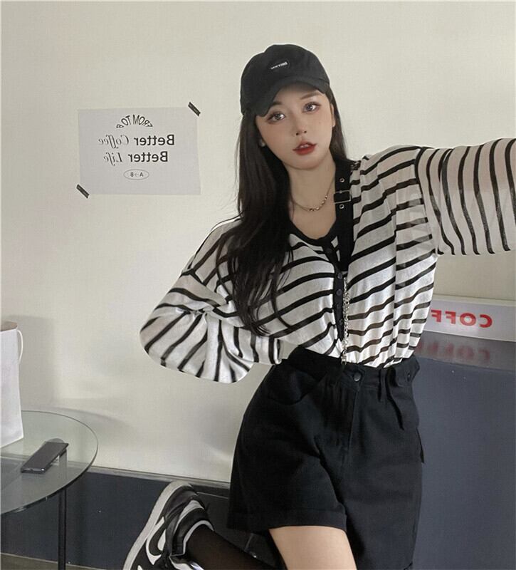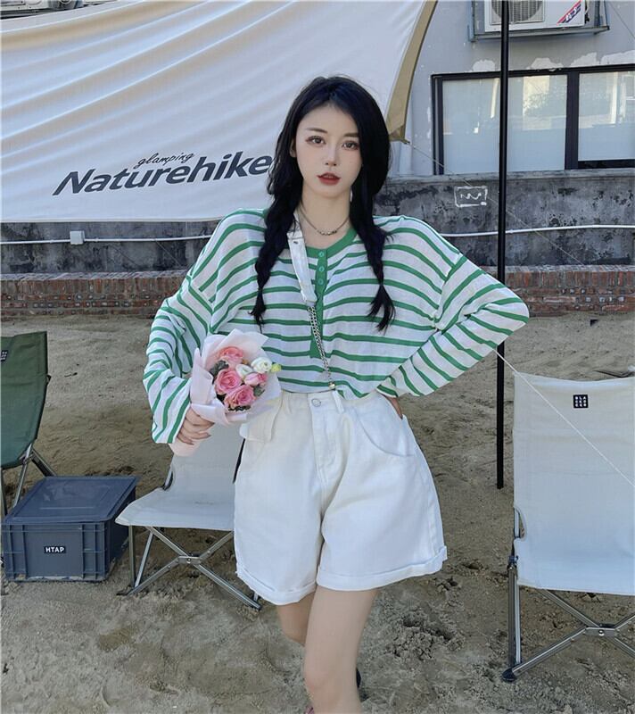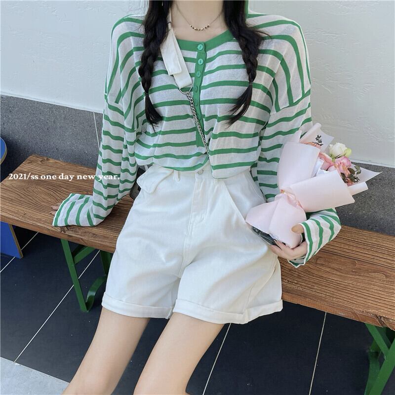 ラウンドネックストライプニットTシャツ ハイウェストウェストポケットショーツ ロング ブルマー クロスボディ Oネック Xiaofeijia42118140941