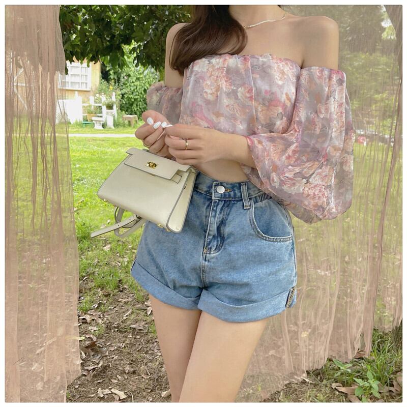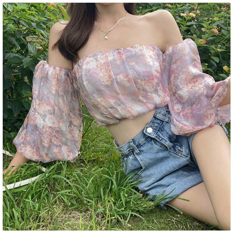 シフォンシャツ ショートスリーブフローラルブラウス サマー ランタンスリーブ 夏物 花柄 ピュア パープル Xiaofeijia27198479559