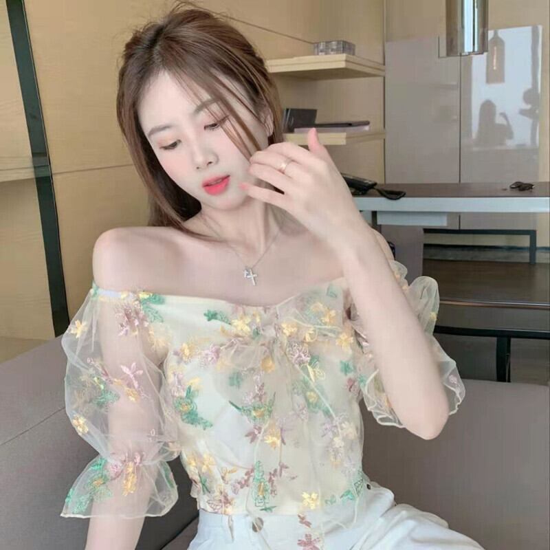 スリーブFlowerデザイン メッシュレースブラウス サマー レッド 刺繍 夏物 フラワーデザイン Xiaofeijia92250557122