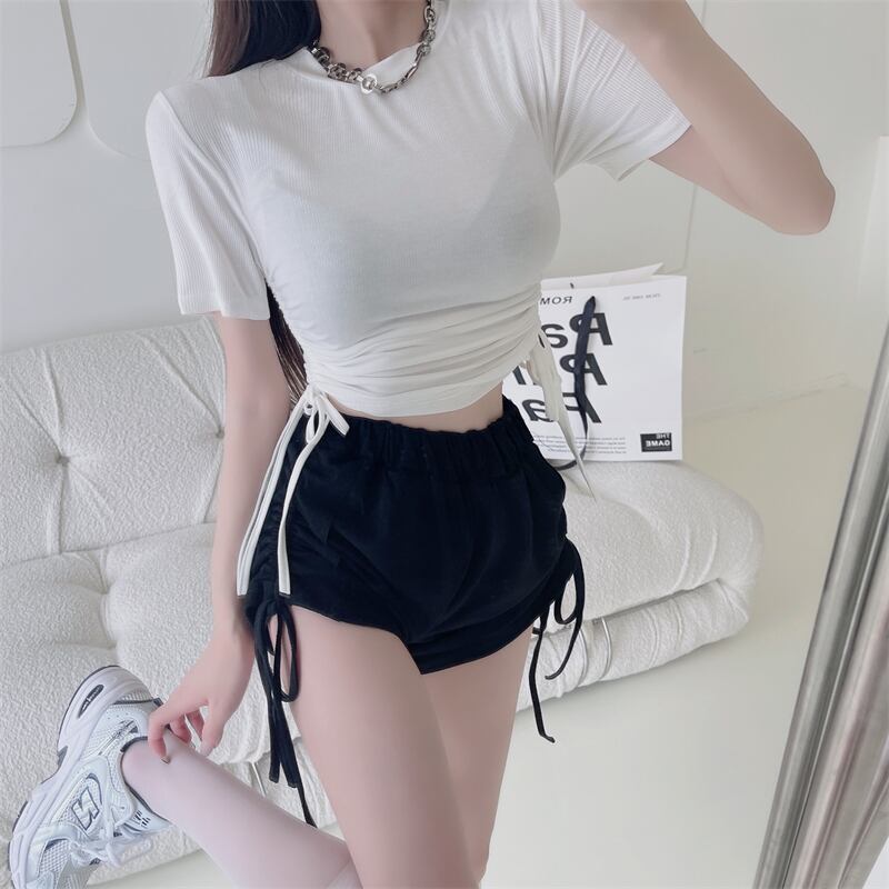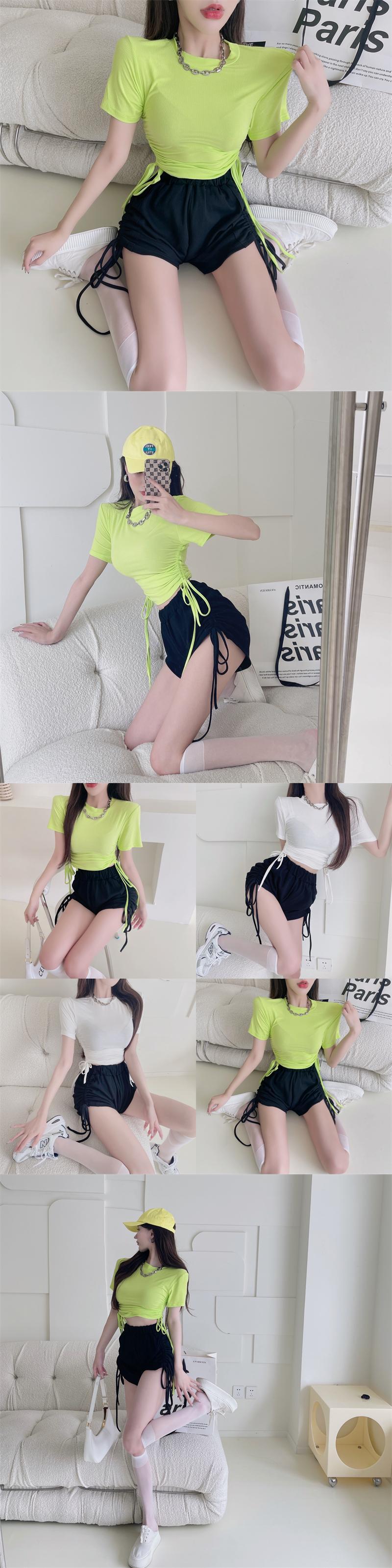 サマーホワイトグリーンショートTシャツ ドレス ギャザーストラップ トップス 夏物 Xiaofeijia46854074194