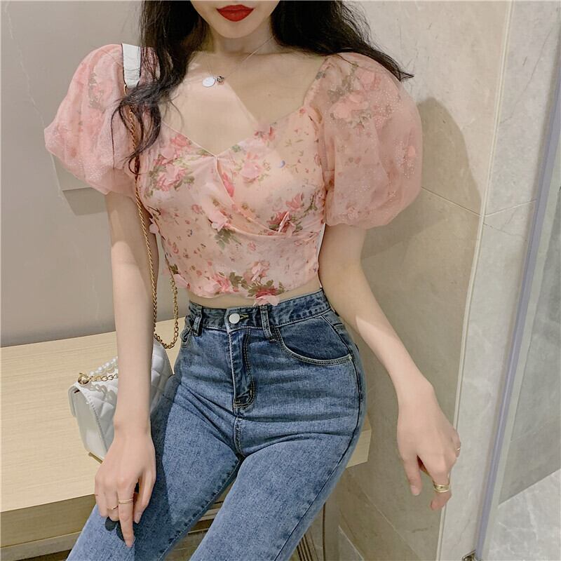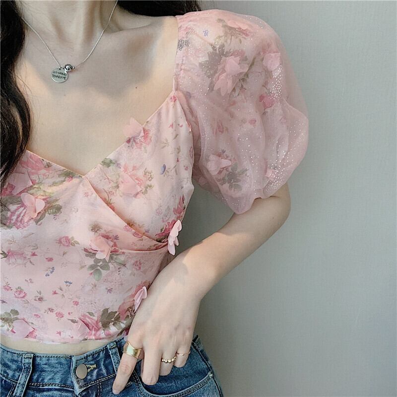 ショートVネックブラウス サマーシフォンシャツ フローラルレディース 夏物 花柄 Xiaofeijia84772080705