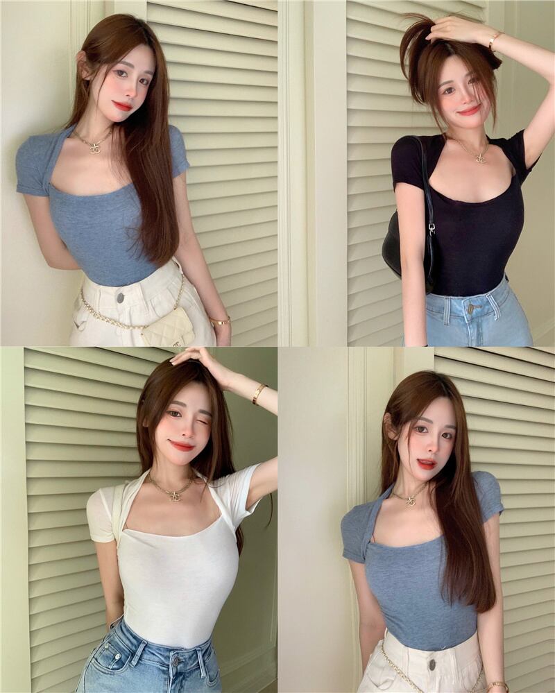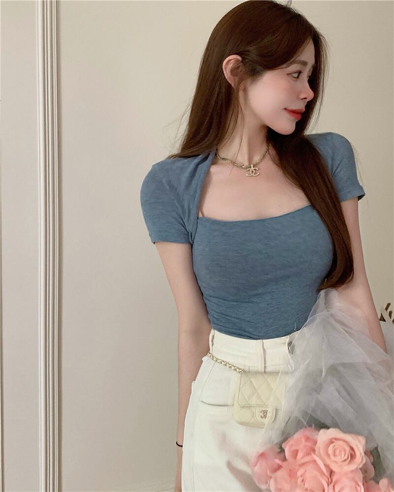 ベーシックショートスリムホワイトブラウス レディースブラックTシャツ シャツ スクウェア Xiaofeijia41997072576