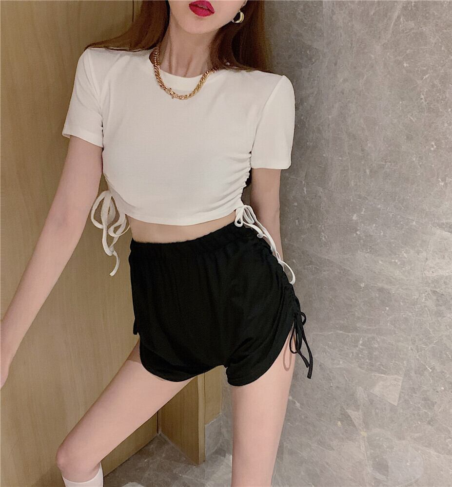 ショートハイウェストギャザーTシャツ サマーホワイトラウンドネックトップス 夏物 Oネック Xiaofeijia40161235570