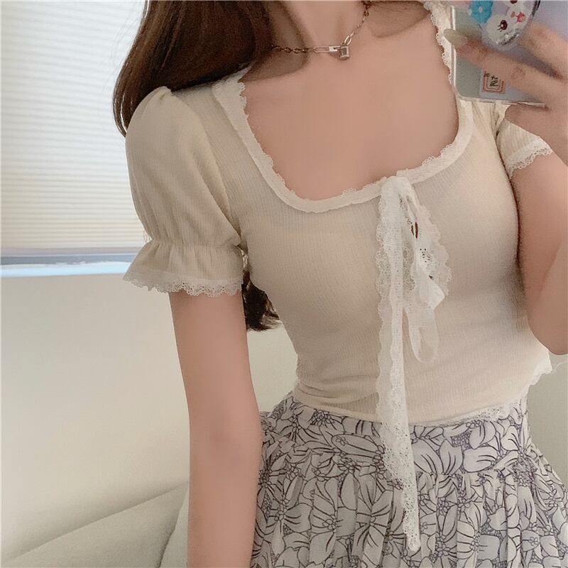 レースリボンTシャツ レディースサマーFlowerデザイン ハイウェストウェストスカート 夏物 フラワーデザイン スクウェア ステッチ Xiaofeijia34935116207