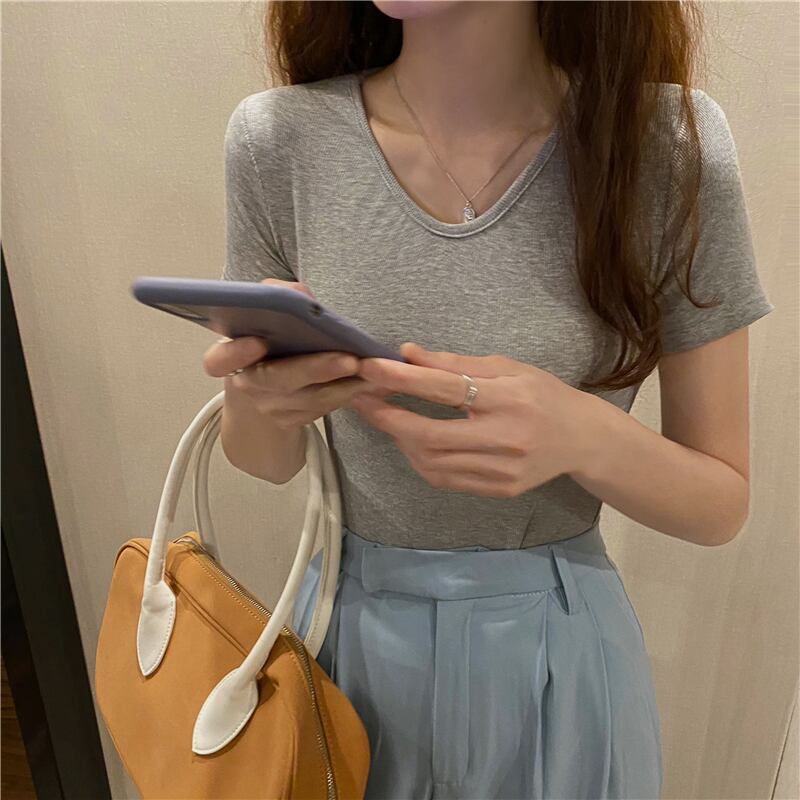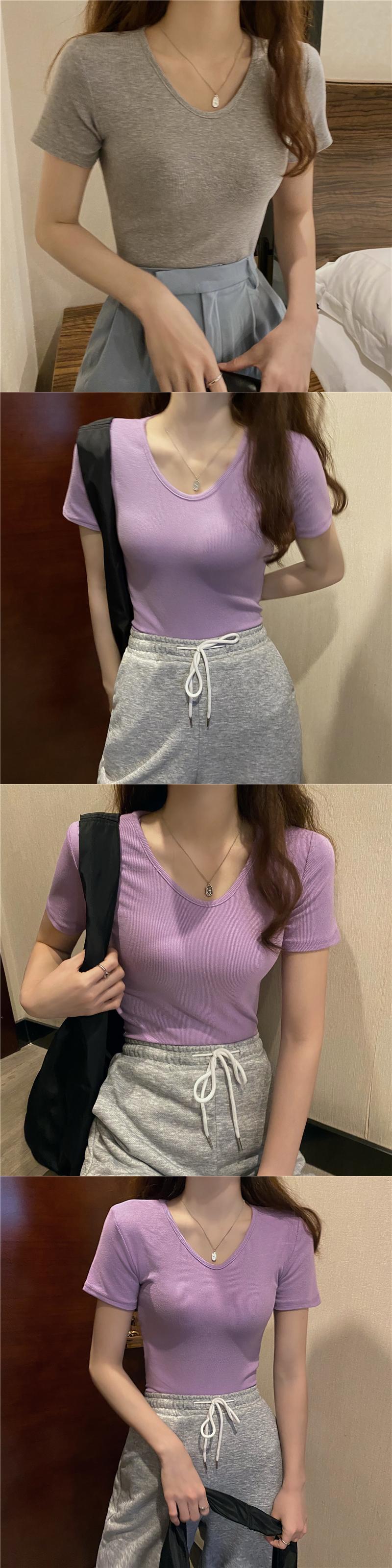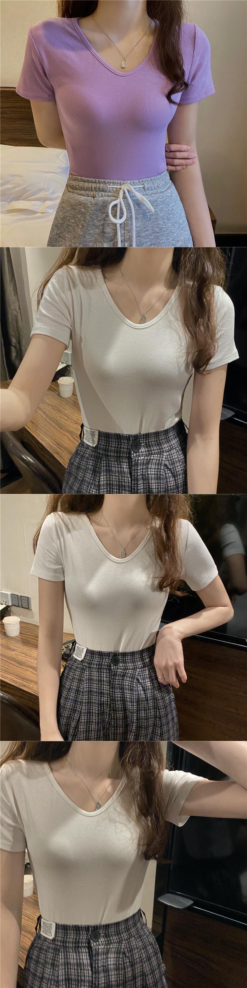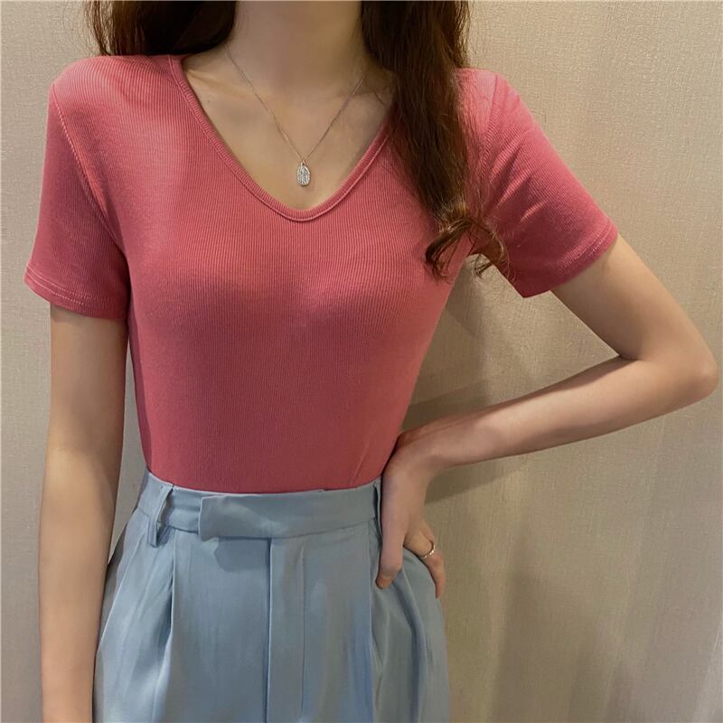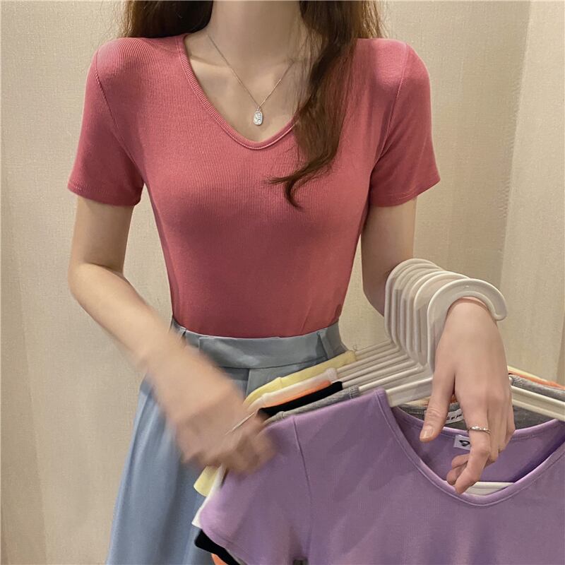 Vネックソリッド カラースリムシャツ Tシャツ ソリッドカラー Xiaofeijia23357977428