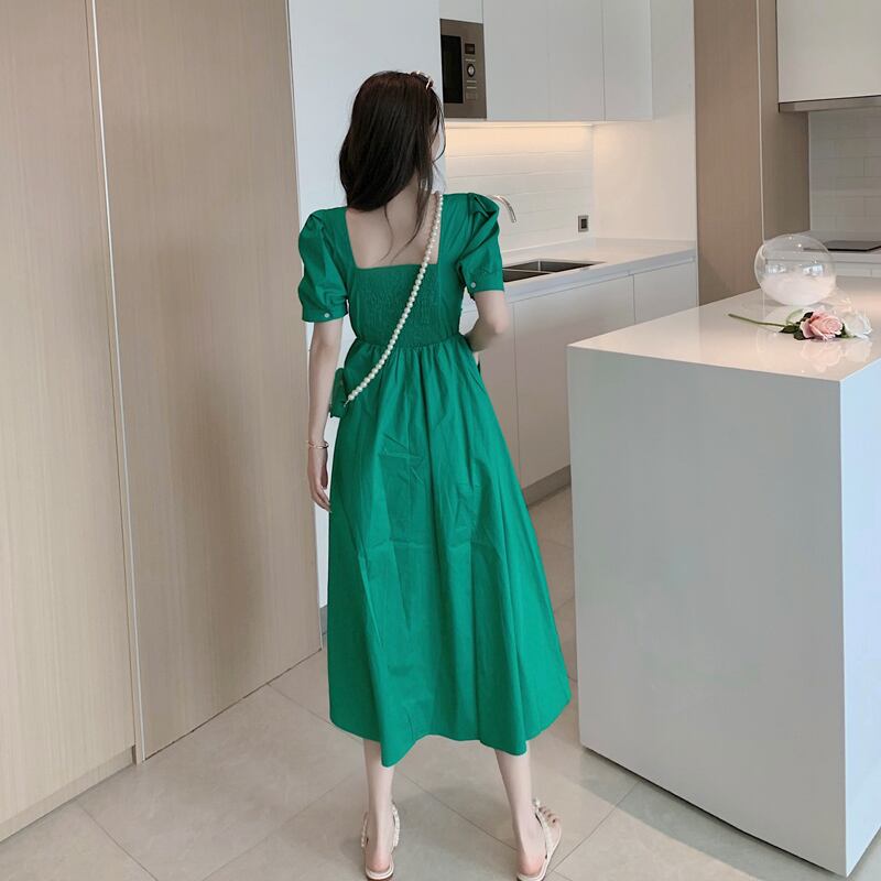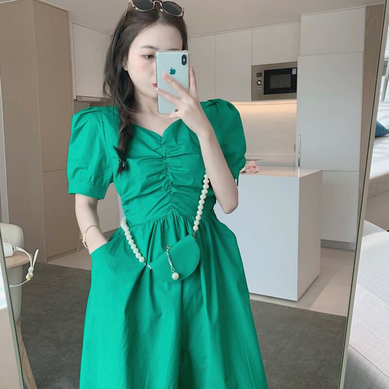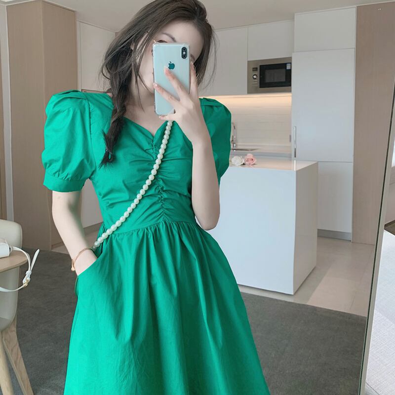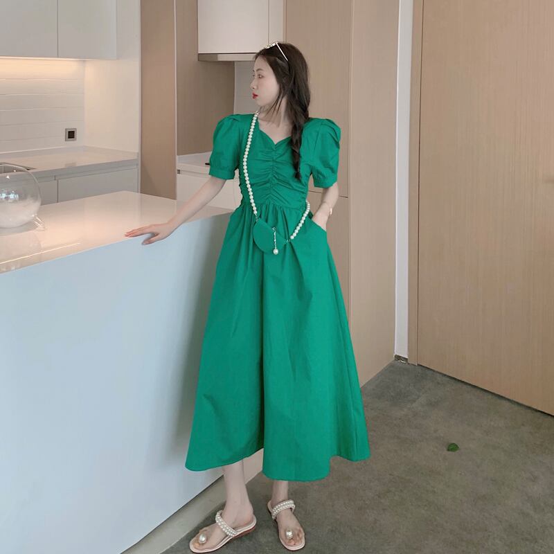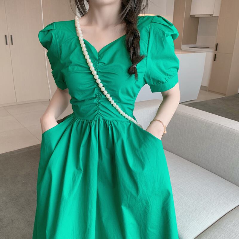 スタンダードプリーツVネックドレス レディース薄手スリーブロングスカート パールチェーン レトロ サマー 夏物 真珠 Xiaofeijia36573750756