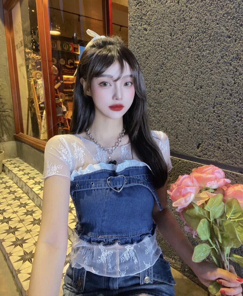 レースサイドトップス サマーバックル ショート 夏物 Xiaofeijia56823508414
