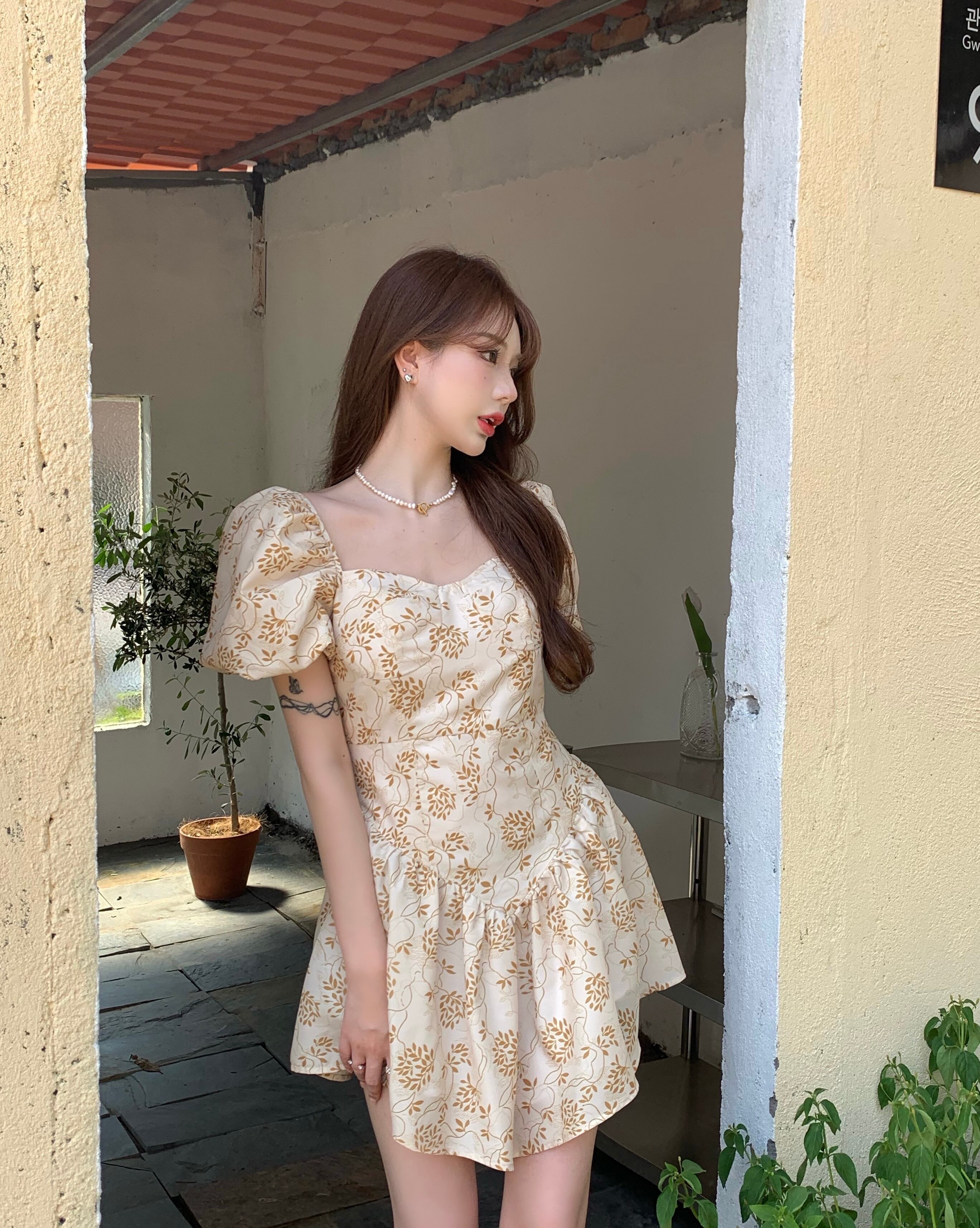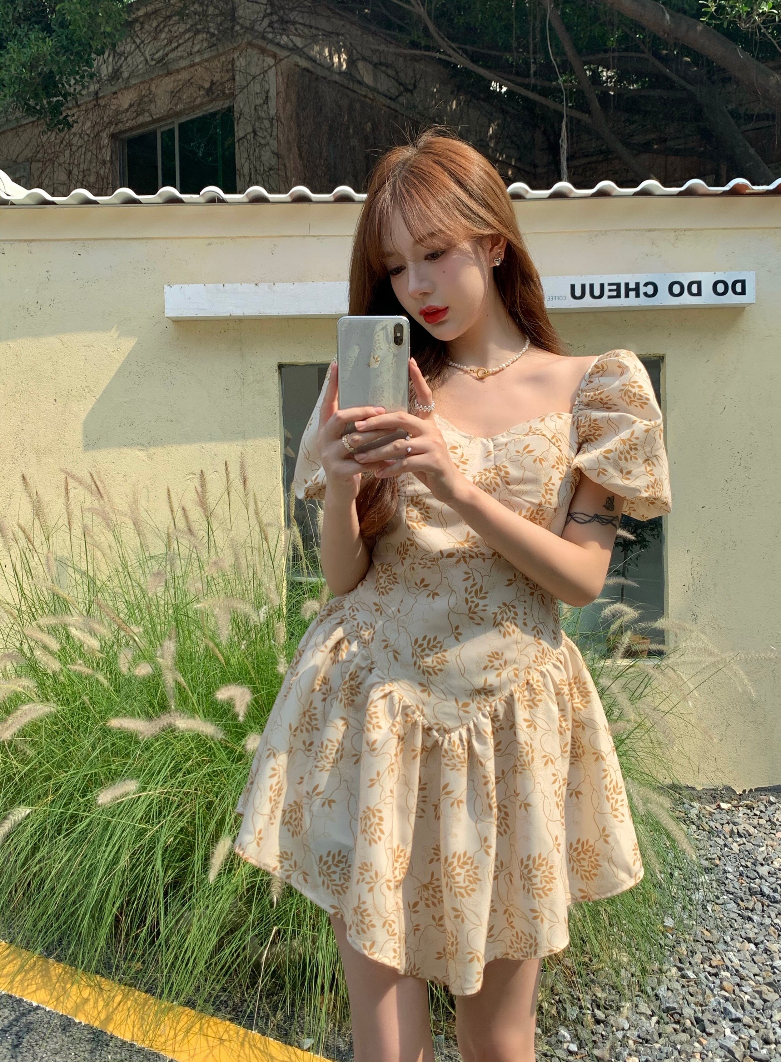 プリント柄ハイウェストスリムドレス ランタンスリーブ Xiaofeijia48522541279
