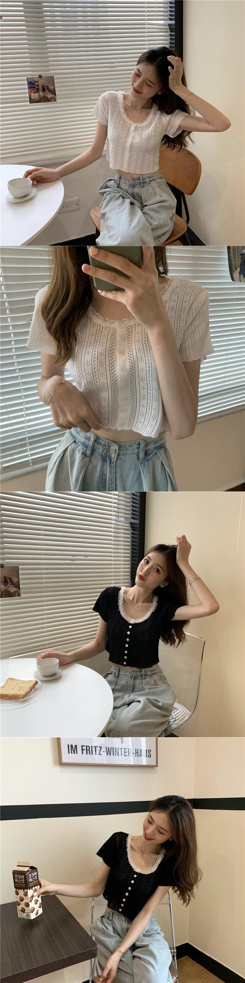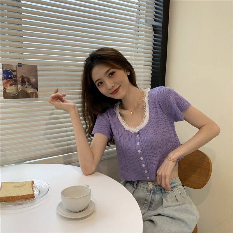 スタイルレースショートニットトップス ステッチ Xiaofeijia43427080428