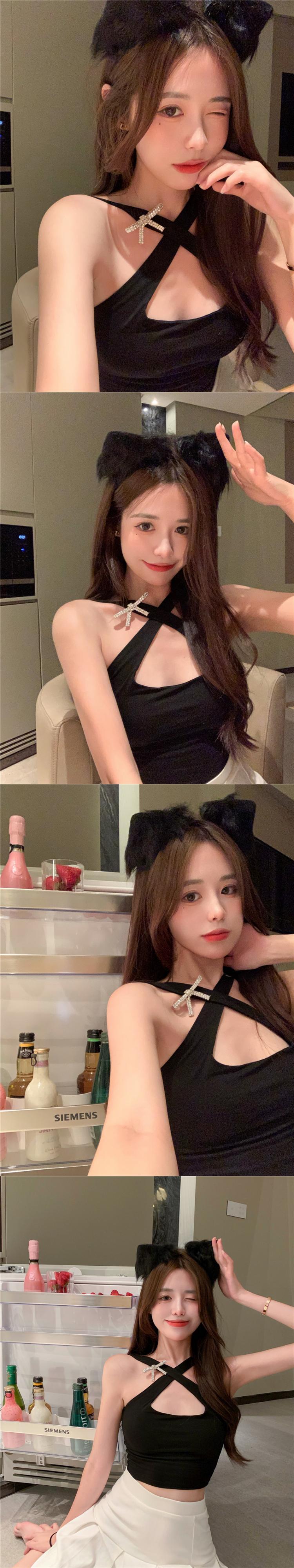 ラインストーンブローチ クロススタイルトップス レディースショートストレッチ リボン エラスティック 伸縮 ヨーロピアン Xiaofeijia14531853152