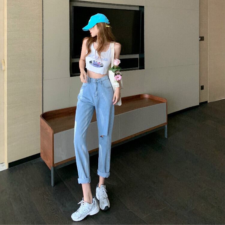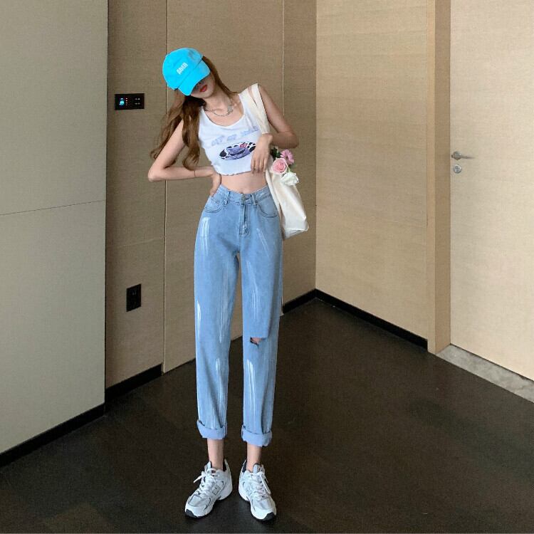 ジーンズ サマールーズ薄手パンツ ハイウェスト レッド 夏物 Xiaofeijia853794663