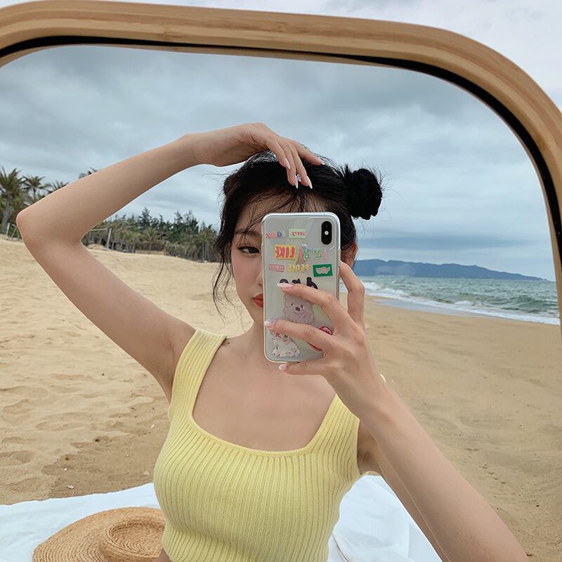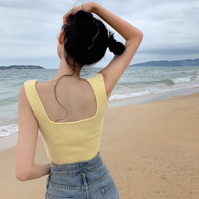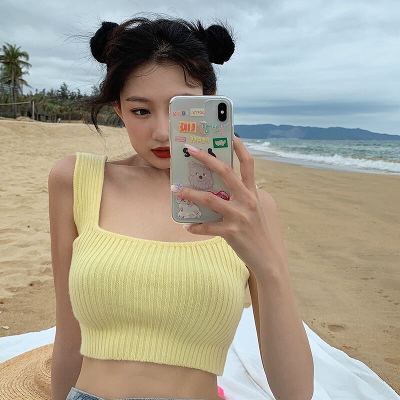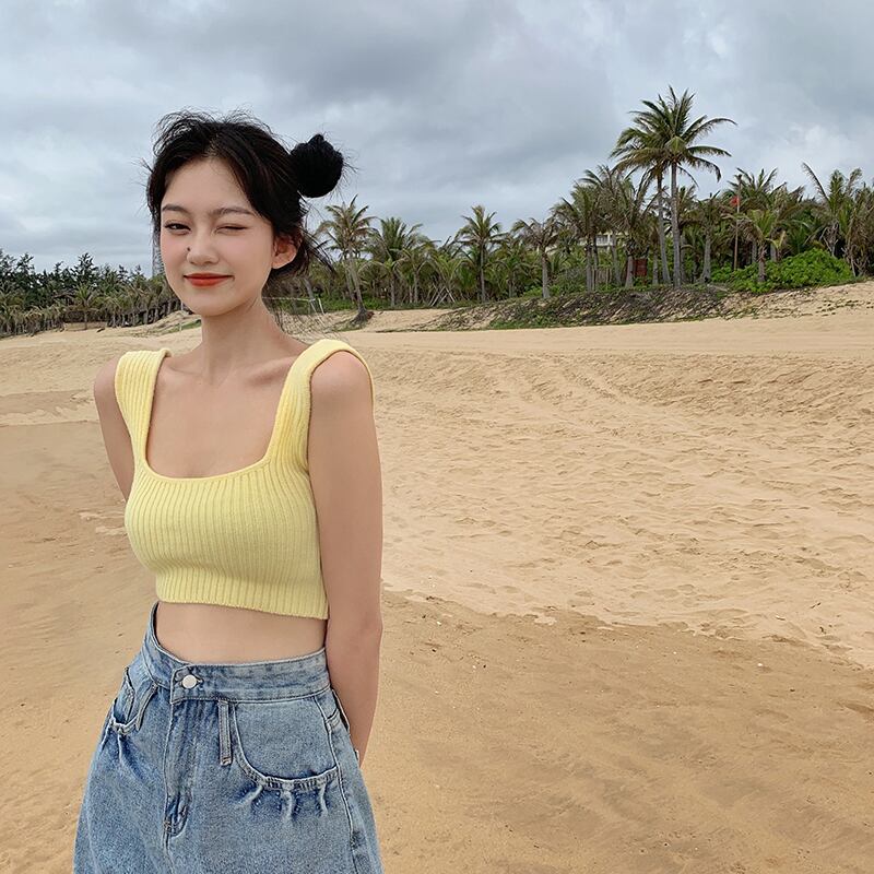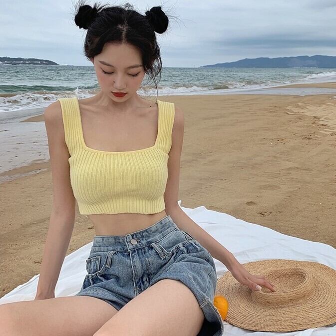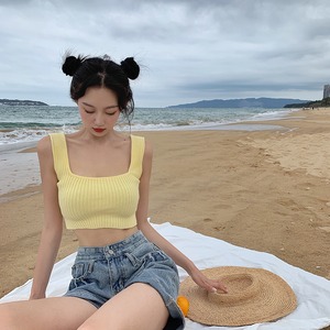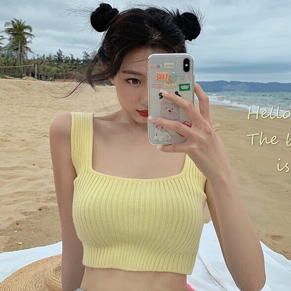 サマーショートイエローニットトップス 夏物 Xiaofeijia23741511850