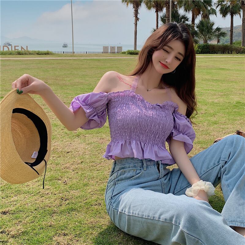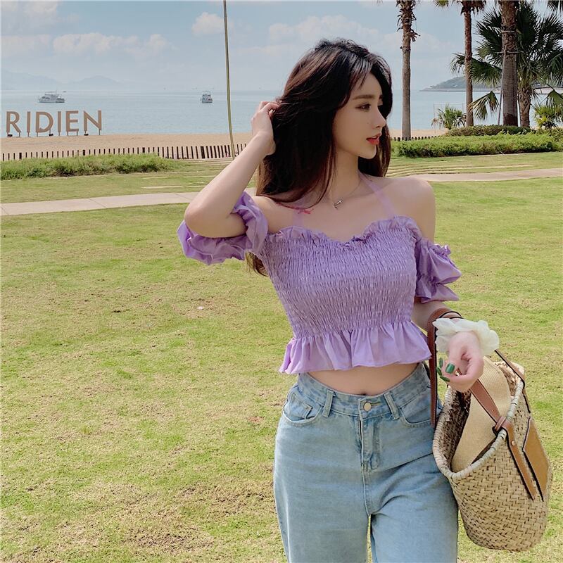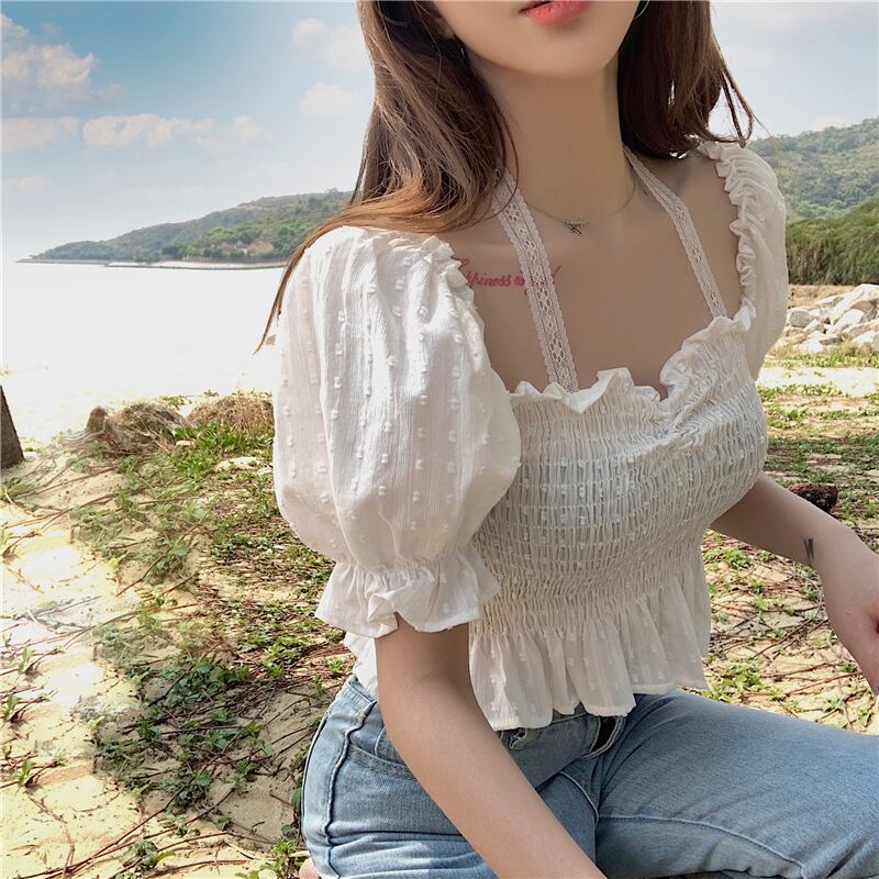 レースストラップレスブラウス シャツ スリムショートサマー 夏物 Xiaofeijia6404599596
