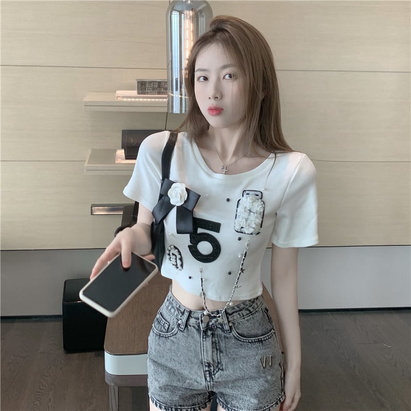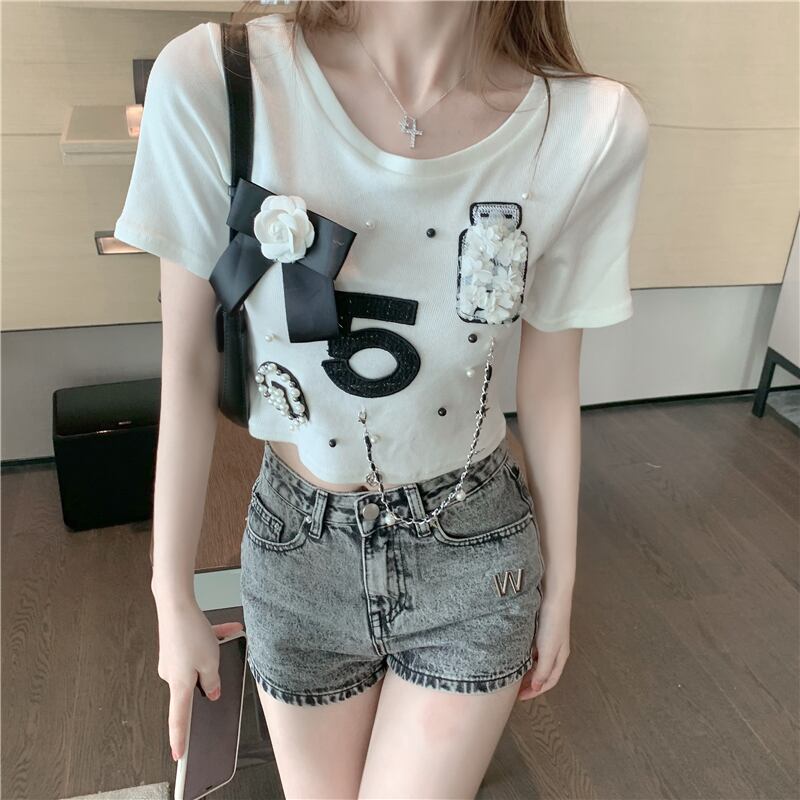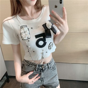 チェーン ショートホワイトTシャツ サマーラウンドネックトップス 大人ガーリー スウィート キュート カジュアル 夏物 Oネック Xiaofeijia18712789323