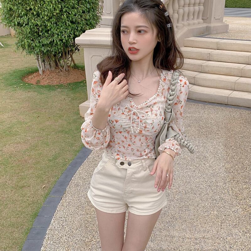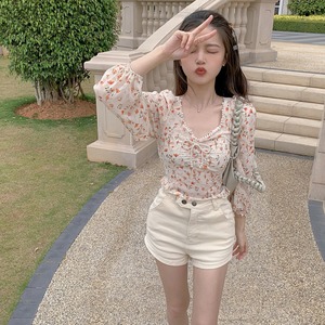 サマーフローラル長袖スリーブショートリボンシフォントップス ロング 夏物 花柄 スクウェア Xiaofeijia62391081871