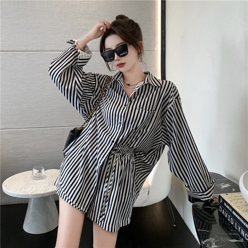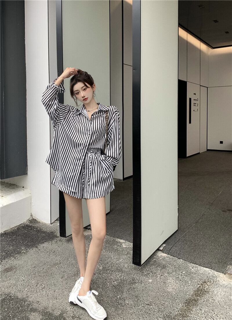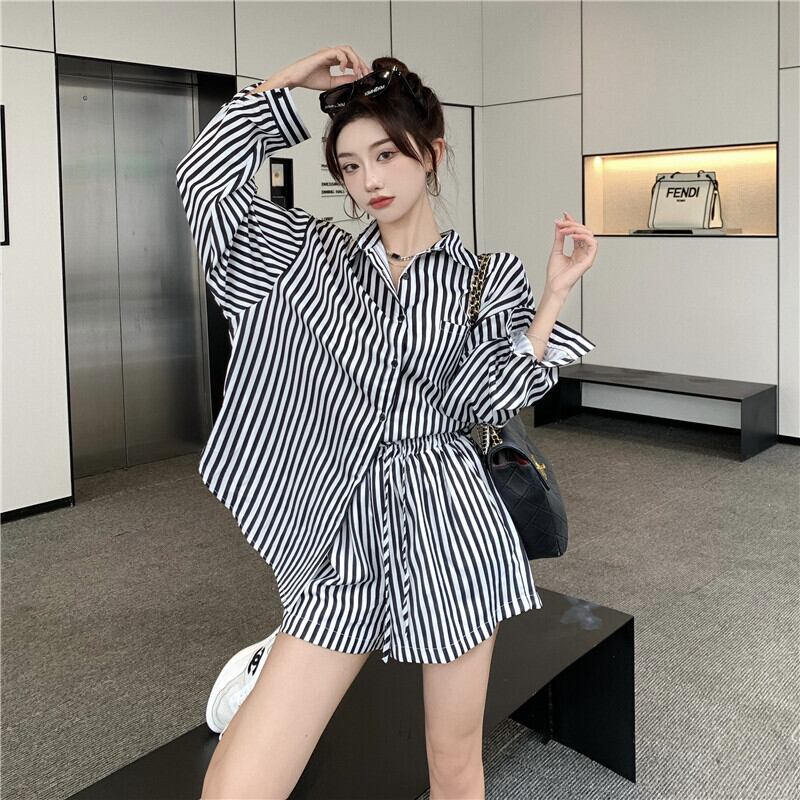 スタンダードブラックホワイトストライプサマーシャツ ストレッチハイウェストショーツ レッド レトロ エラスティック 伸縮 夏物 ブルマー Xiaofeijia75989999140