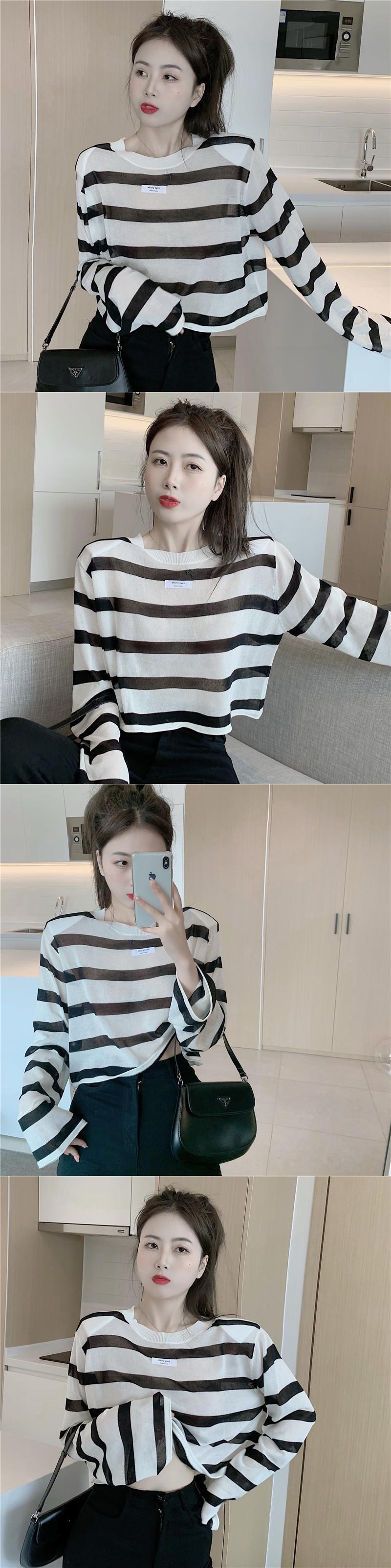 ラウンドネックストライプニットシャツ Oネック Xiaofeijia63929605546