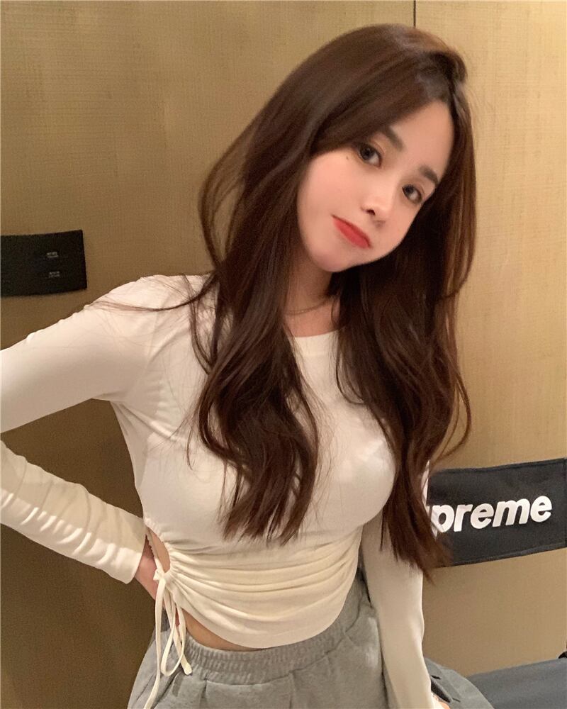 Tシャツ シャツ スプリングラウンドネックギャザートップス スリムフィットショート ロング 春物 Oネック Xiaofeijia26357961033