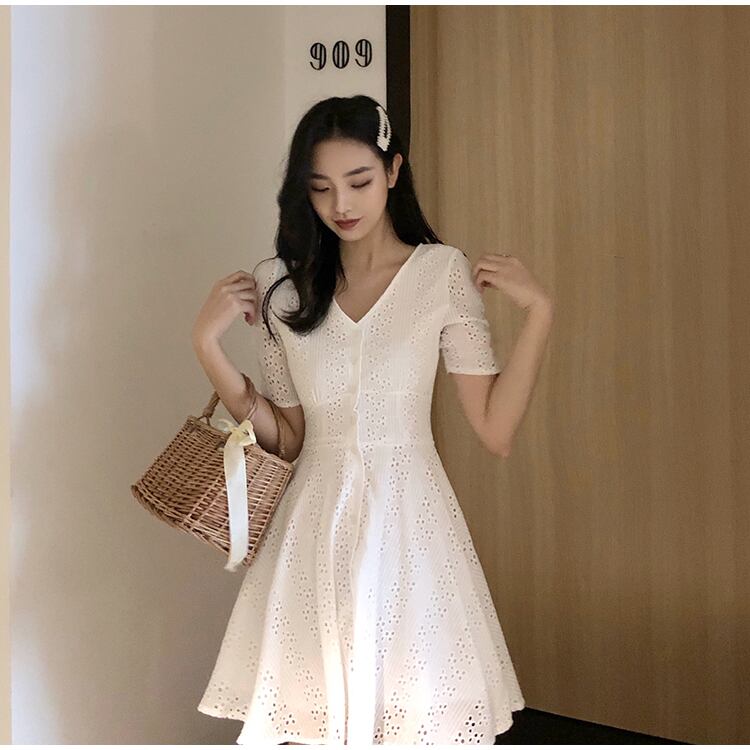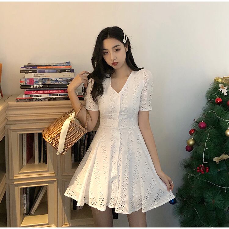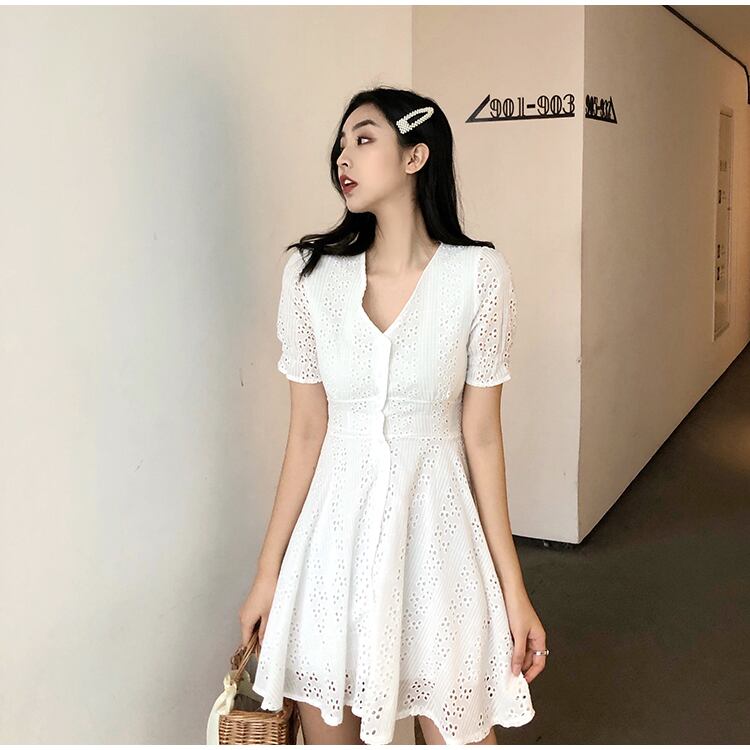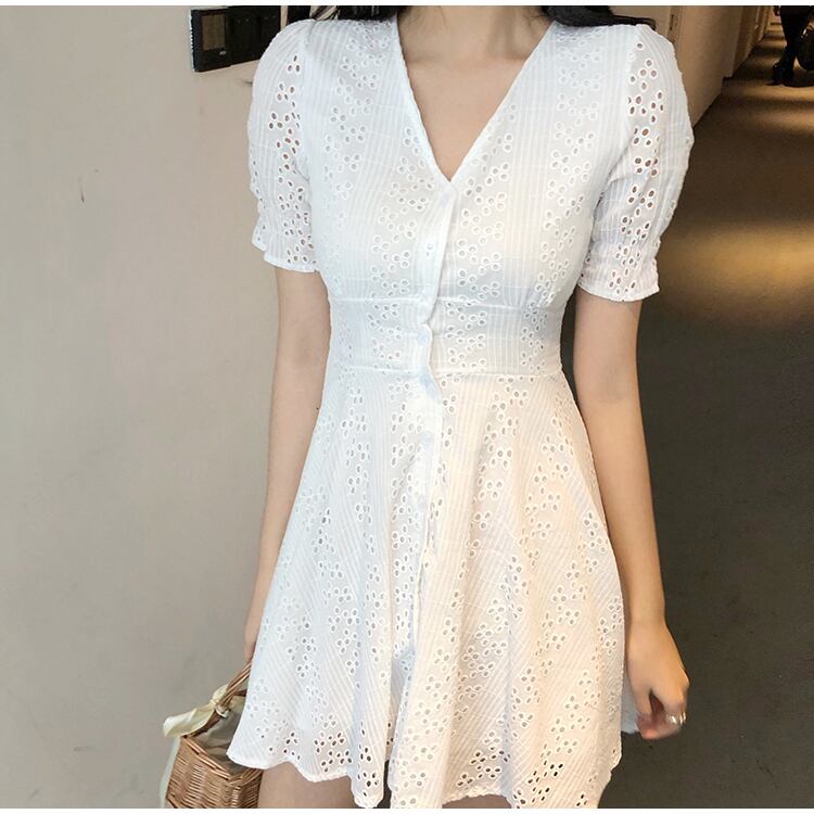 刺繍ホワイトドレス ウェスト薄手スリーブAラインスカート ランタンスリーブ 大人ガーリー スウィート キュート カジュアル Xiaofeijia22474893437