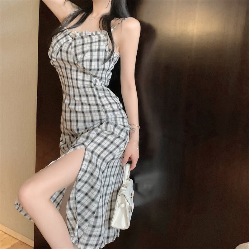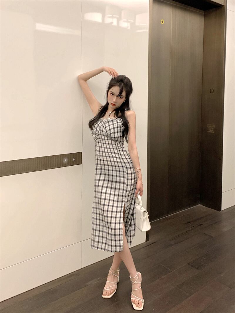 スキニーバックレス格子柄ドレス ビーチ Xiaofeijia60283774195
