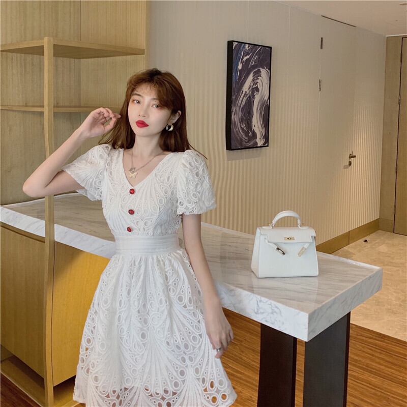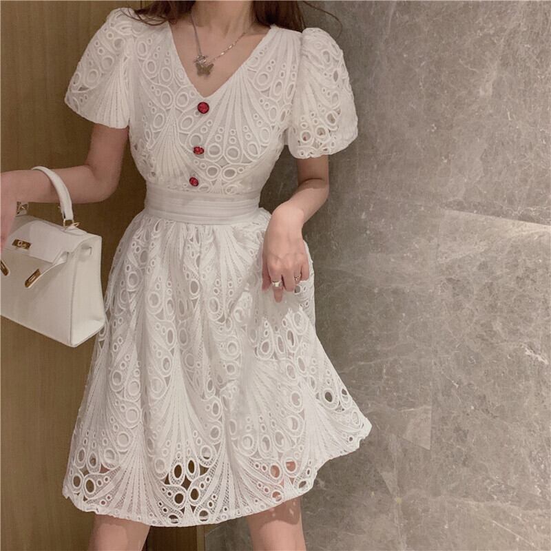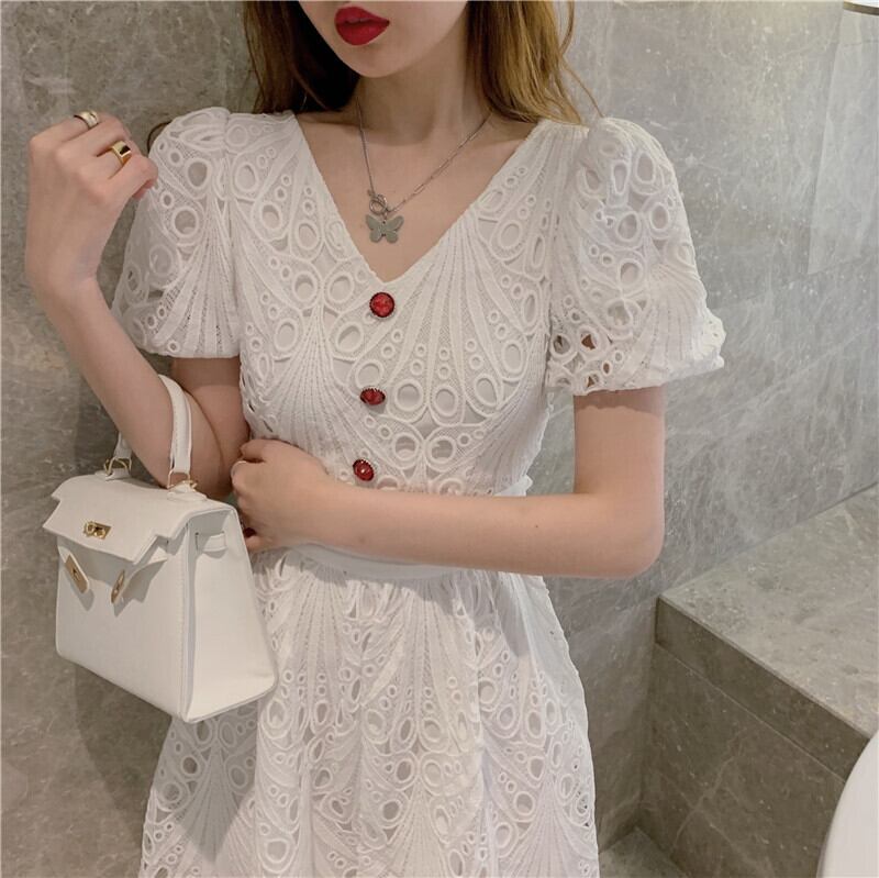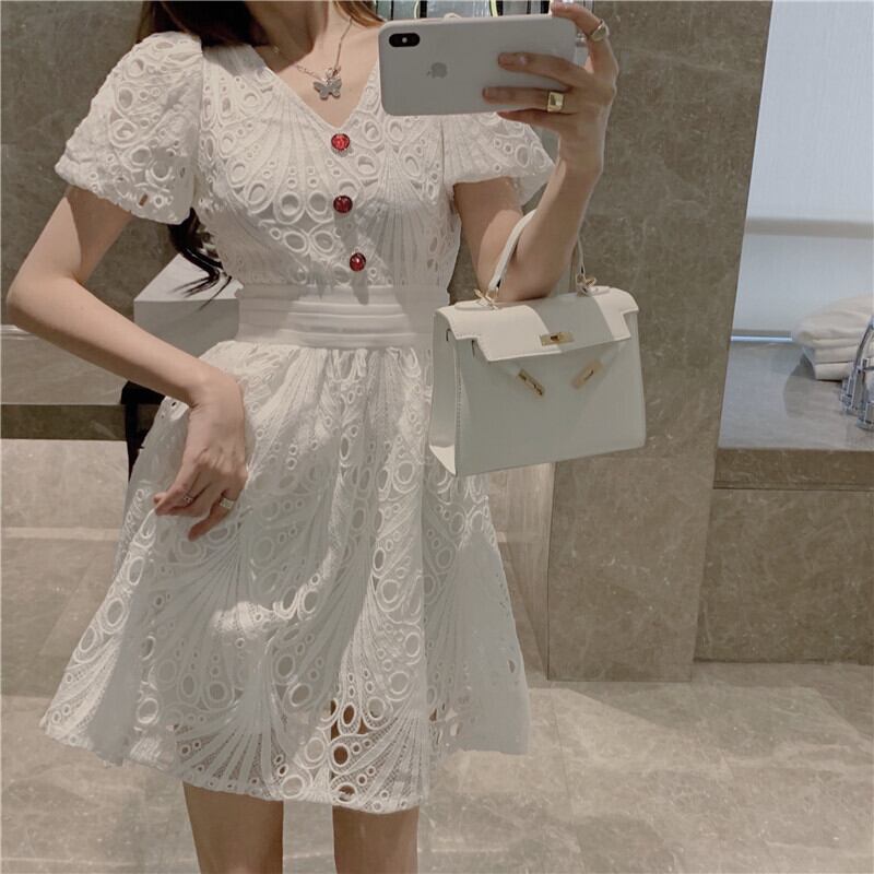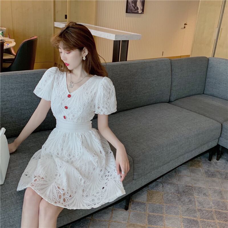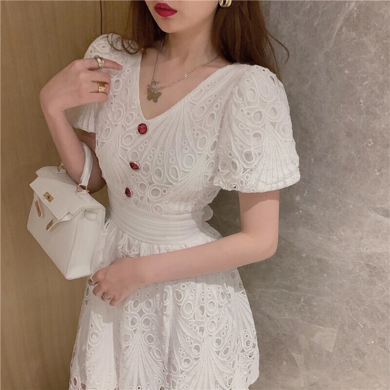 サマー刺繍スリーブVネックハイウェストウェストドレス レディース 夏物 Xiaofeijia17699588997