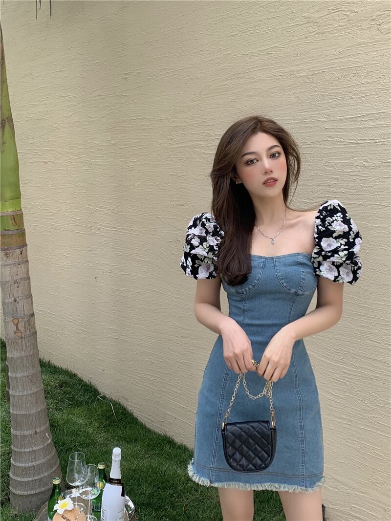 スタンダードカラードレス サマースタイルプリントウェストフローラルAラインショートスカート レディース レトロ 夏物 花柄 スクウェア Xiaofeijia26594589125