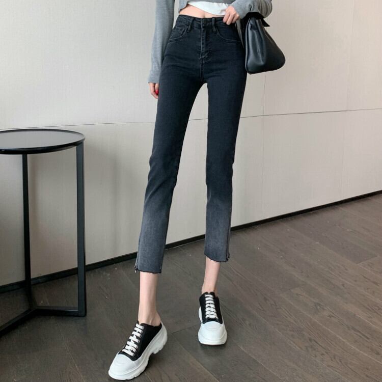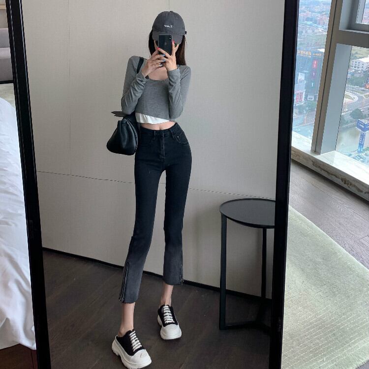 サマースタイルブラックグレー薄手パンツ ジーンズ クロップド 夏物 Xiaofeijia10748685440