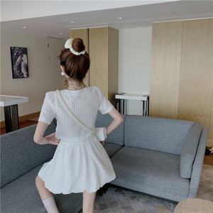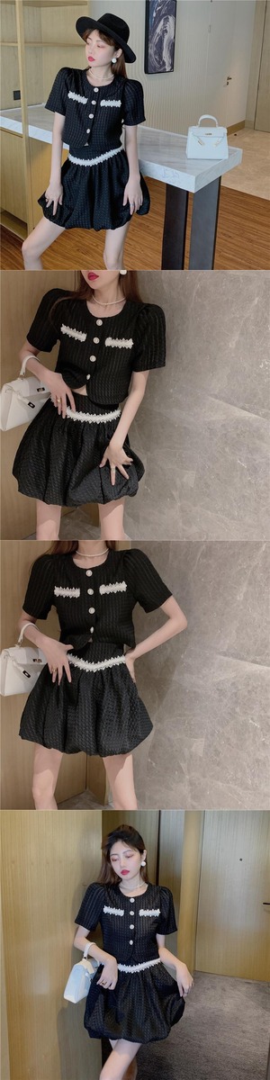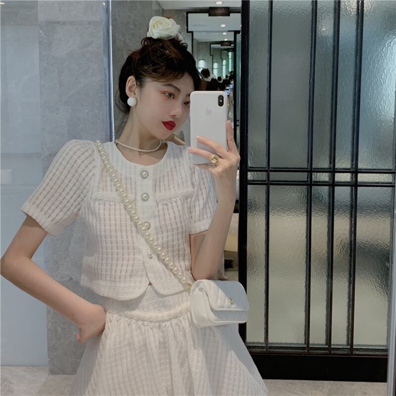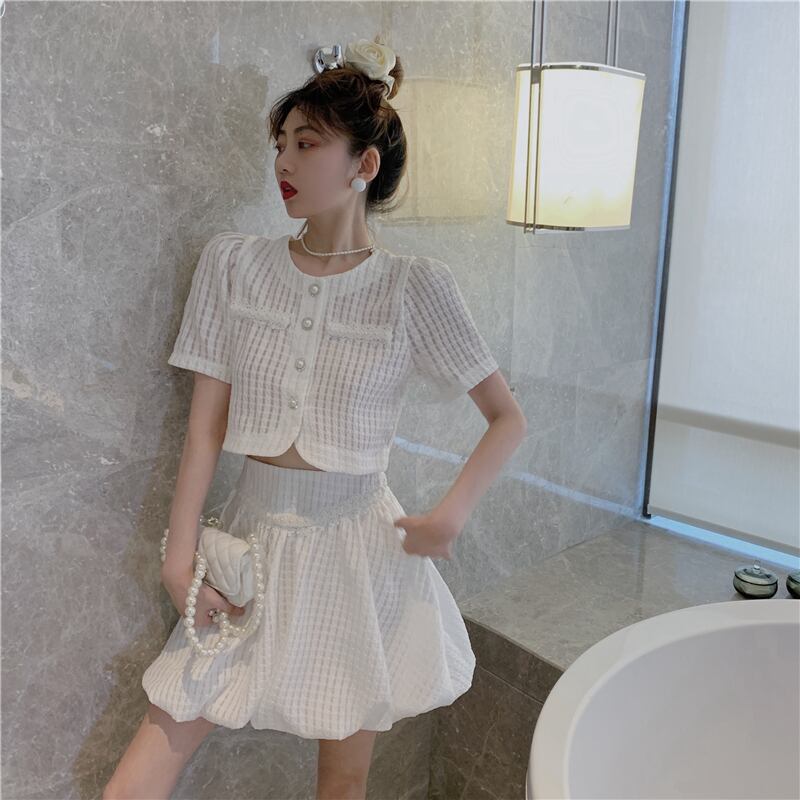 スタイルパールボタンスリーブショートトップス ハイウェストウェストFlowerデザイン スカート サマー ふわふわ 夏物 真珠 フラワーデザイン Xiaofeijia66097738218