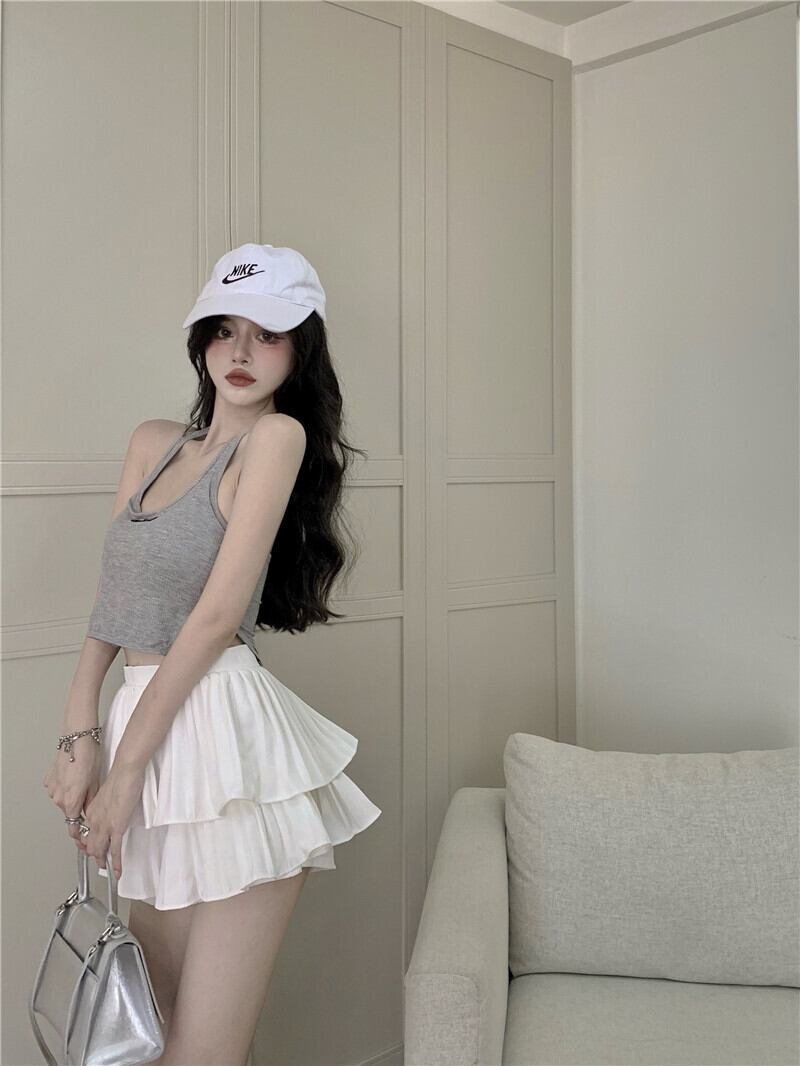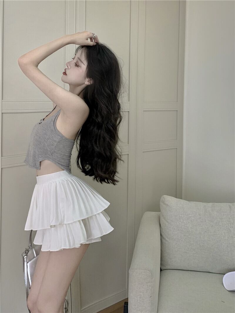 Aラインホワイトスカート ダブルプリーツショート Xiaofeijia83259687719
