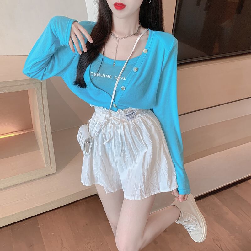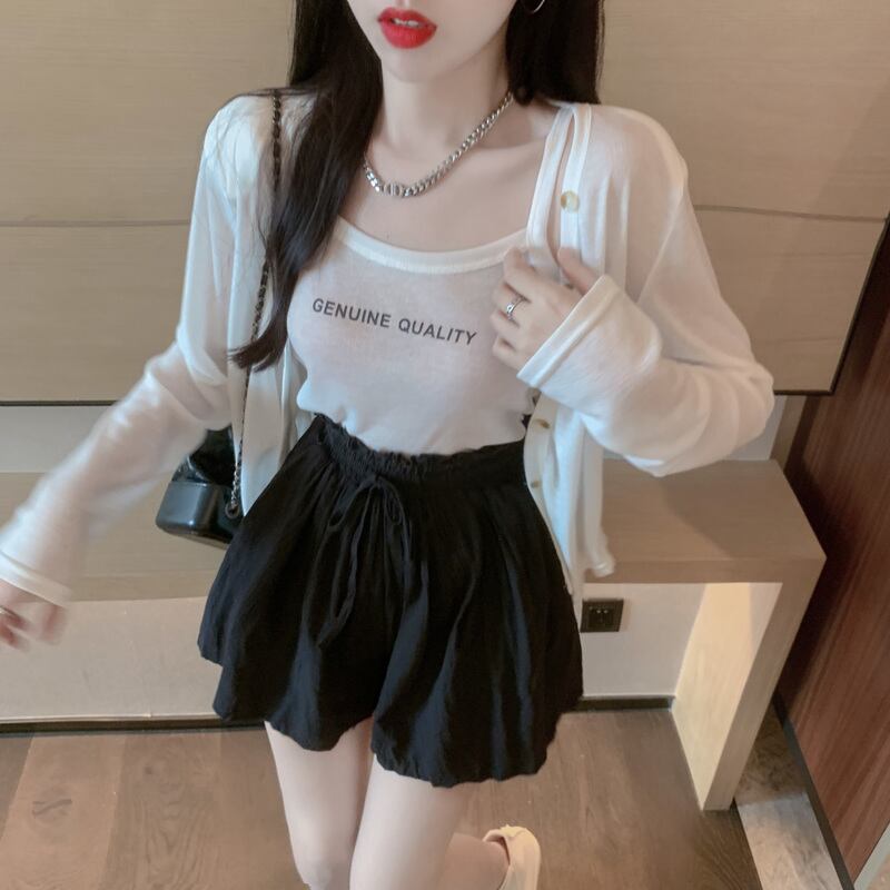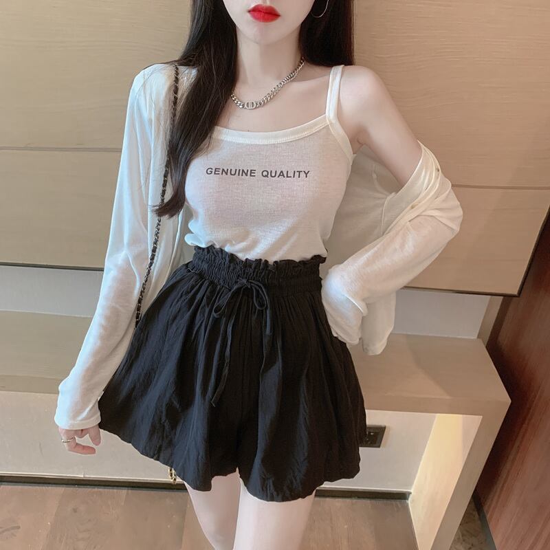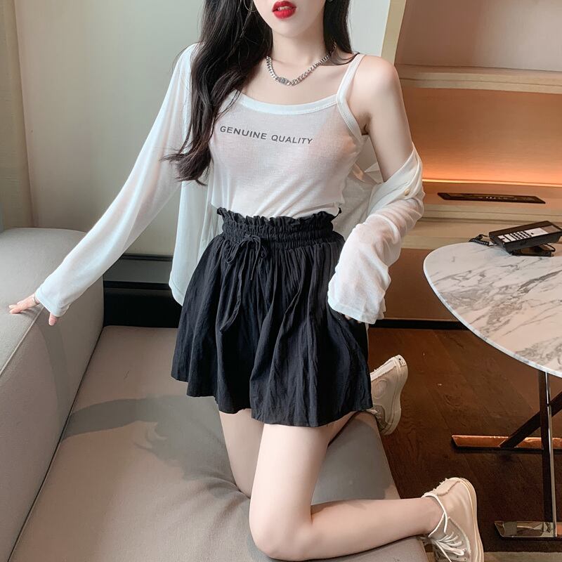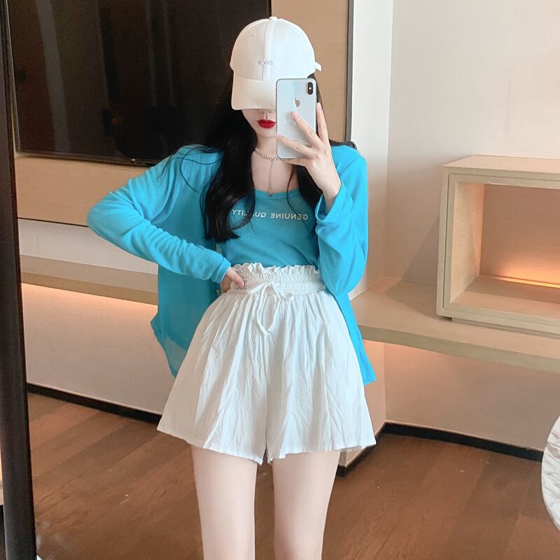 レッドサマー薄手カーディガンプリーツハイウェストFlowerデザイン ショーツ レディース ロング ストリート 夏物 ブルマー フラワーデザイン Xiaofeijia76793133642