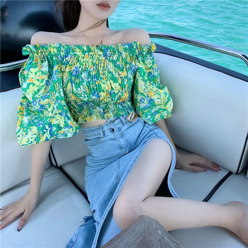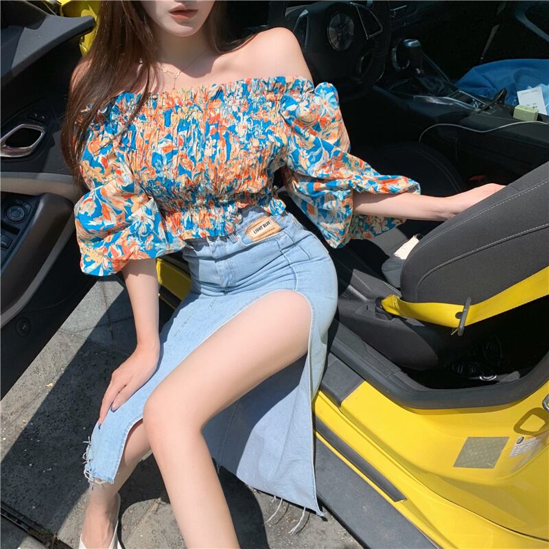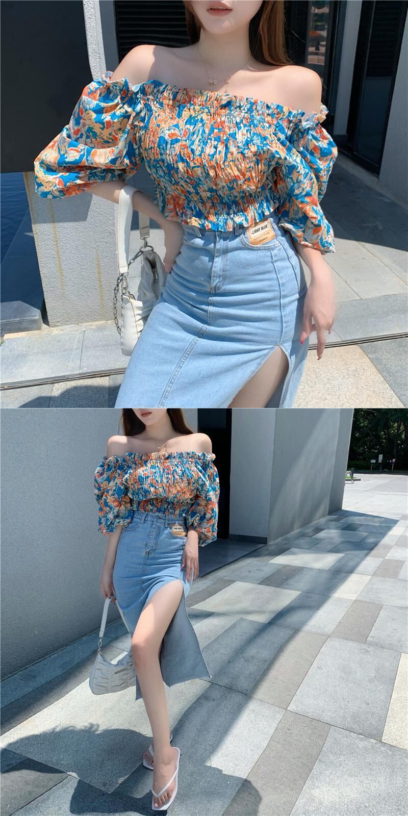 スタイルフローラルシャツ ショートブラウス サマーサイドスリットスカート 夏物 花柄 Xiaofeijia40029708585
