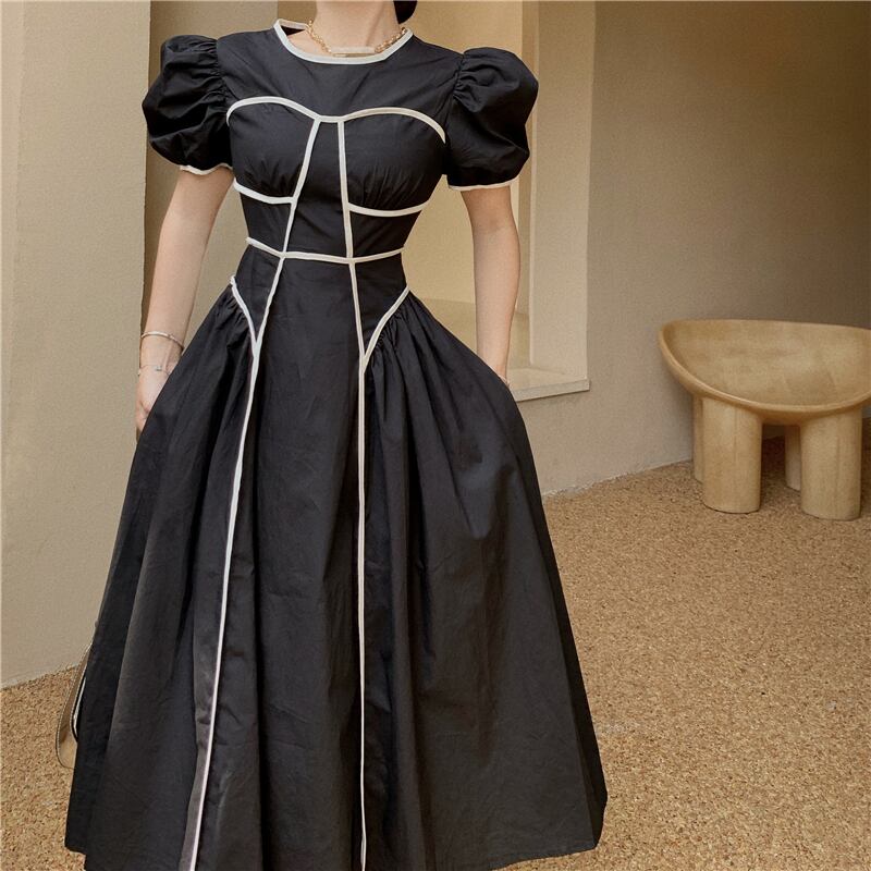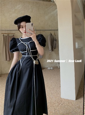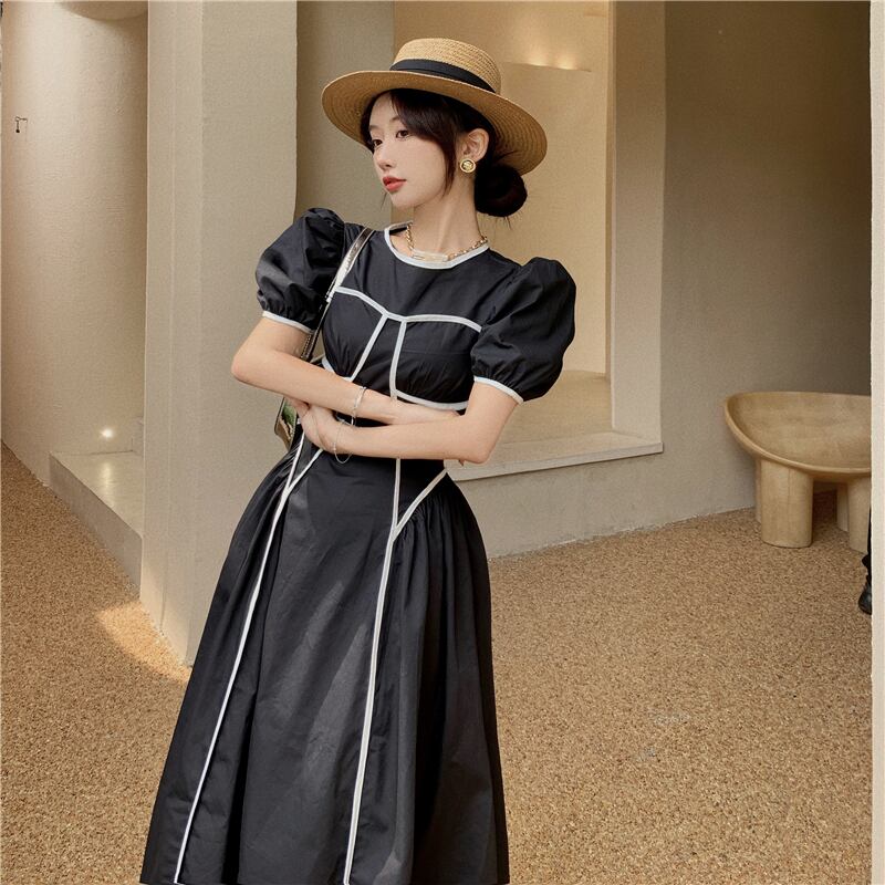 ラインスカート サマーハイウェストウェストスリーブラウンドネックドレス 夏物 Oネック Xiaofeijia41983076503