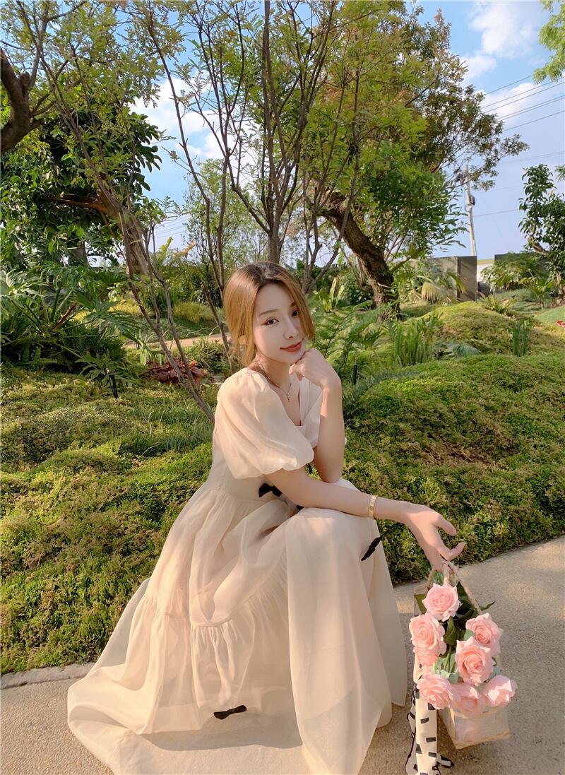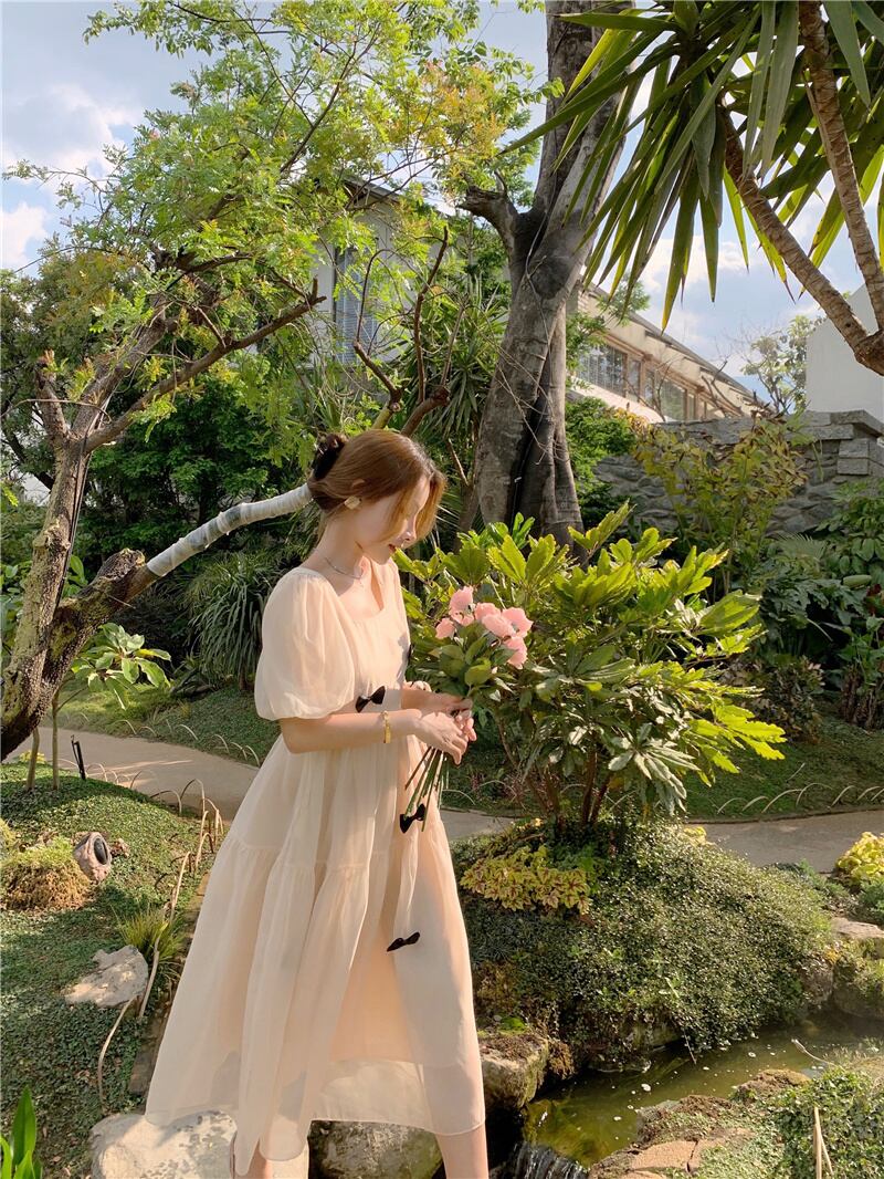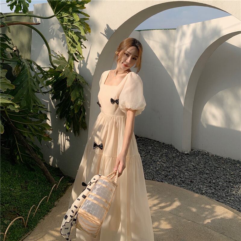 スタイルリボンロングドレス スタンダードカラースカート サマー レトロ 夏物 スクウェア Xiaofeijia25462053861