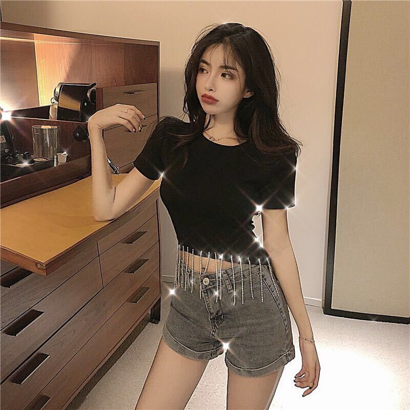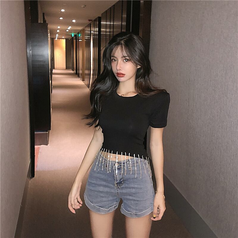 スリムショートTシャツ シャツ サマーラウンドネックラインストーントップス 夏物 Oネック Xiaofeijia20763657572
