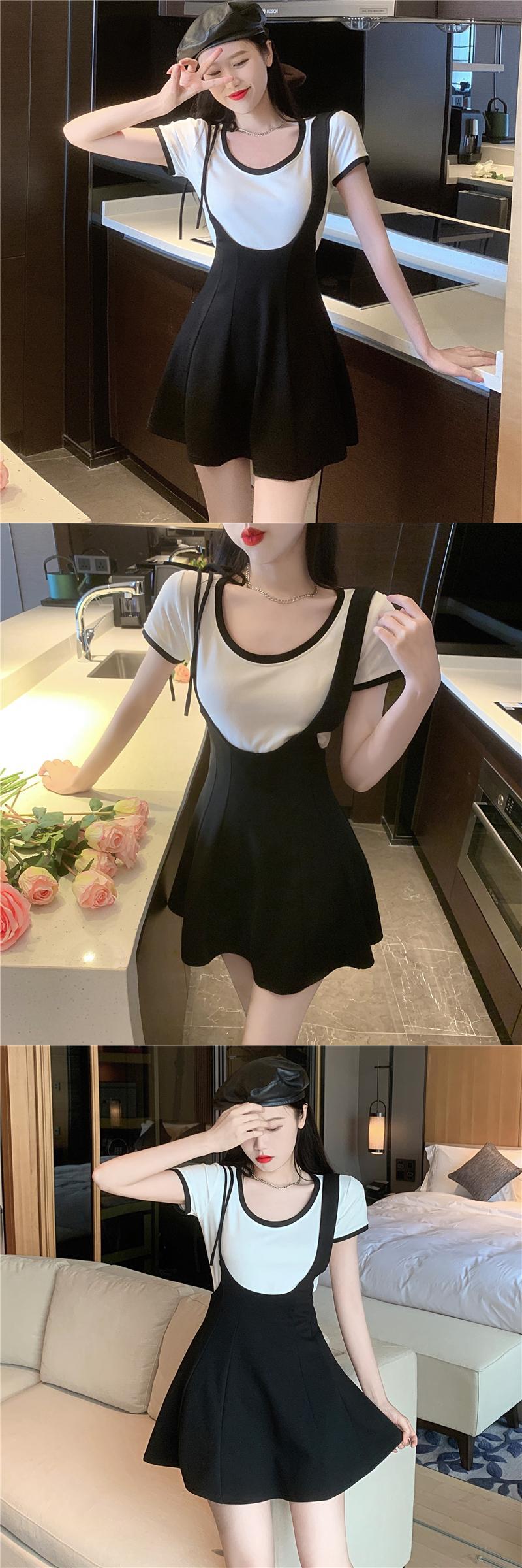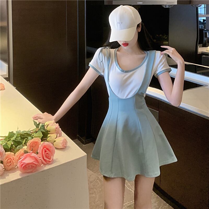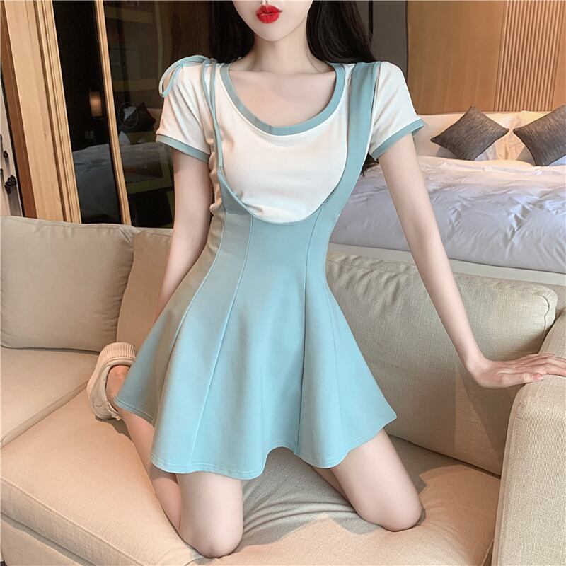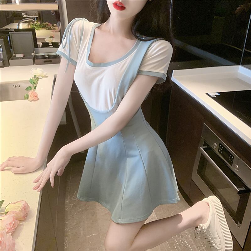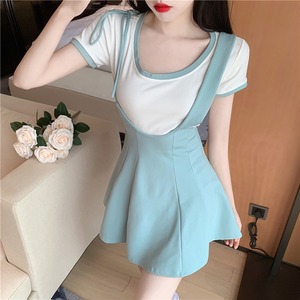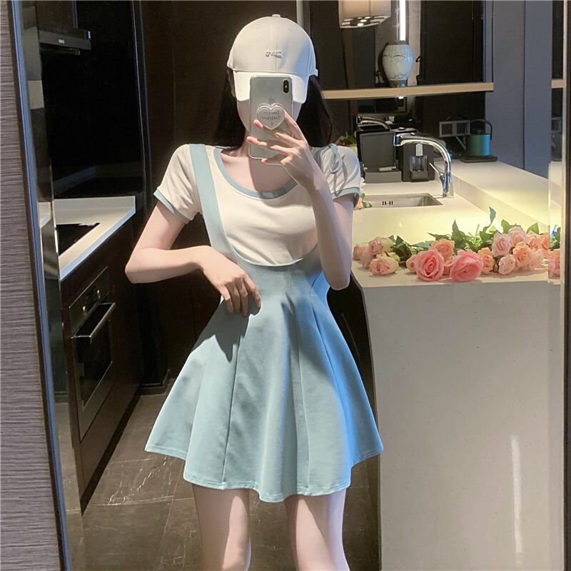 サマーカラーラウンドネックTシャツ ハイウェストウェストスカート レース ストリート 夏物 Oネック レースアップ Xiaofeijia60734252638