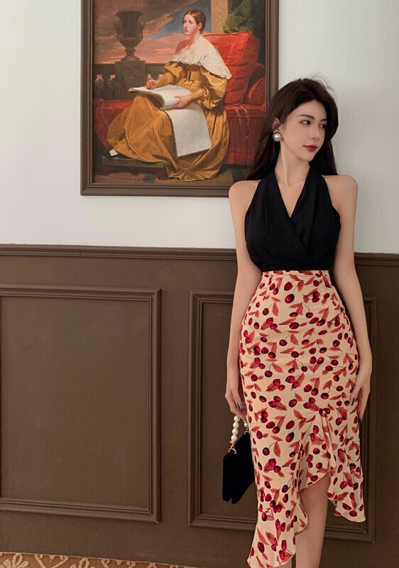 スカート サマーホルタートップス レディースハイウェストウェストフローラル 夏物 花柄 Xiaofeijia59503530334
