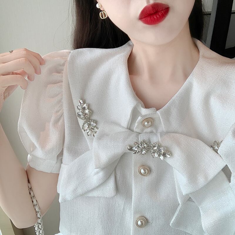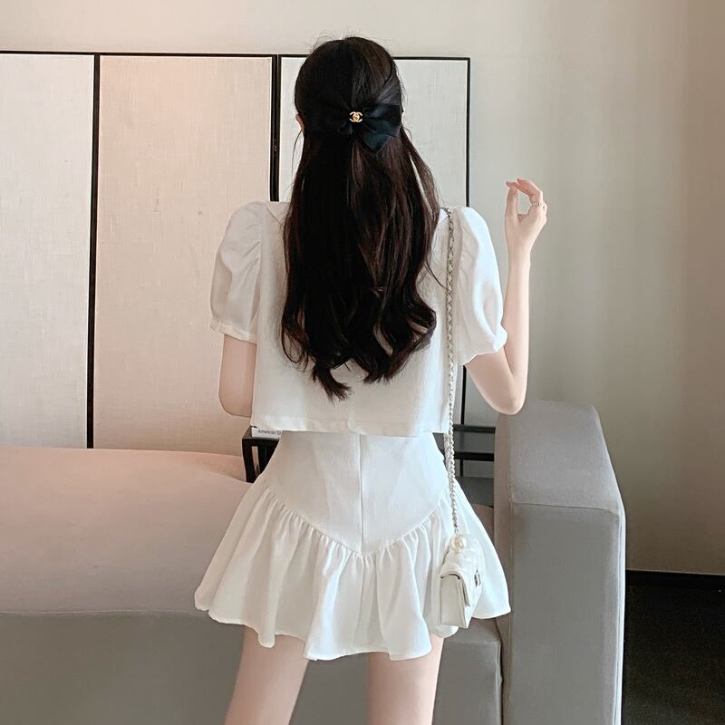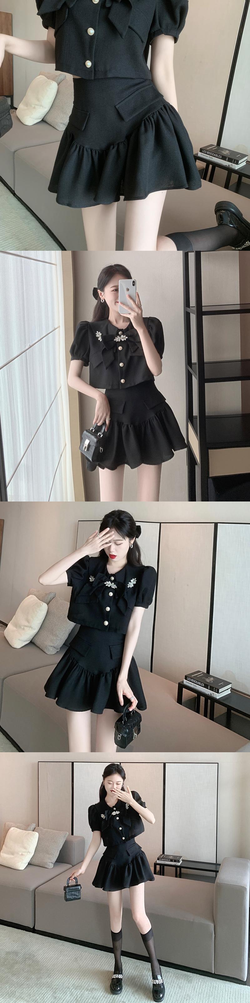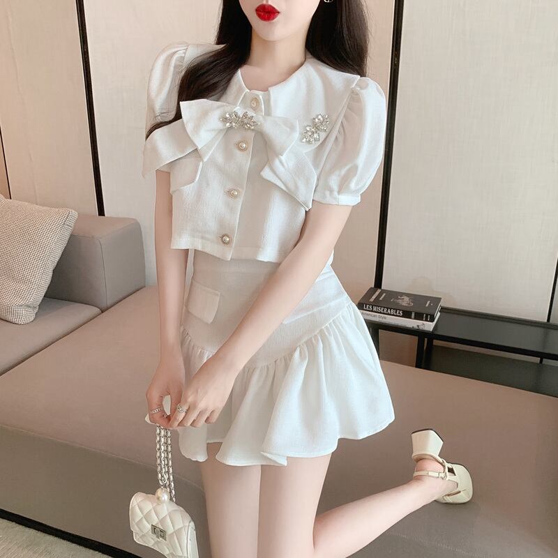 ドレス ラインストーンリボンショートトップス ハイウェストウェストAラインスカート サマー 夏物 Xiaofeijia61908507302