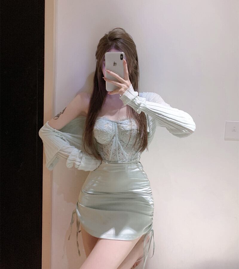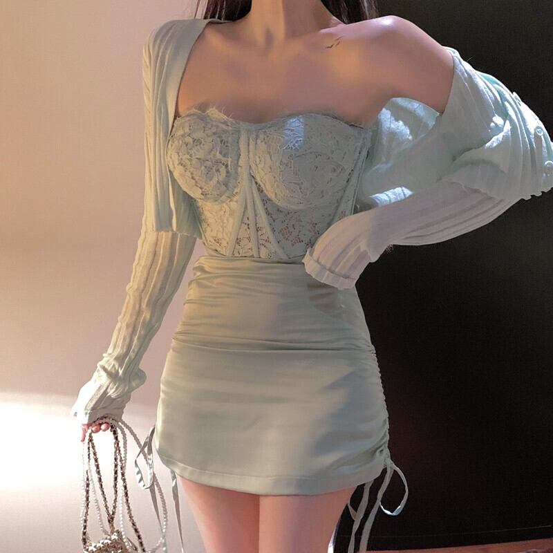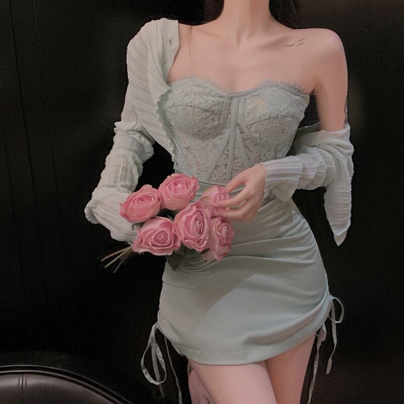 サマーグリーンレーストップス ギャザースカート カーディガン 夏物 Xiaofeijia39729510793