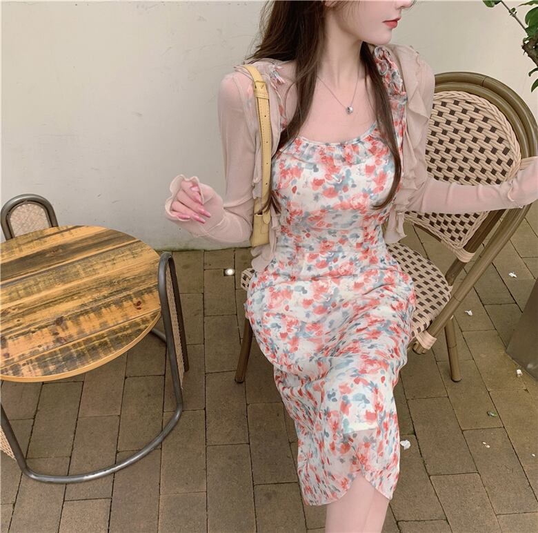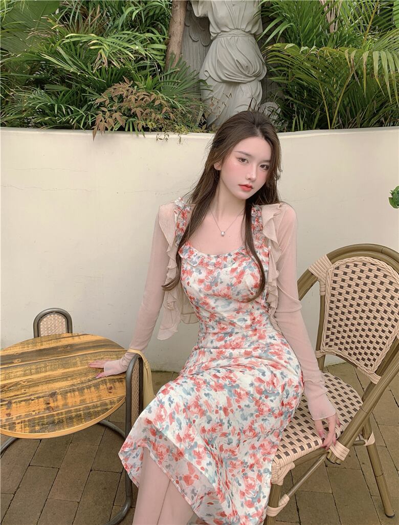 オータムフローラルシフォンドレス ロングスカート 薄手カーディガンジャケット 秋物 花柄 Xiaofeijia40430494784