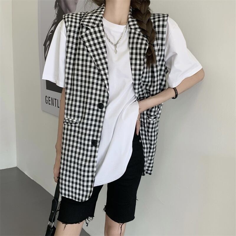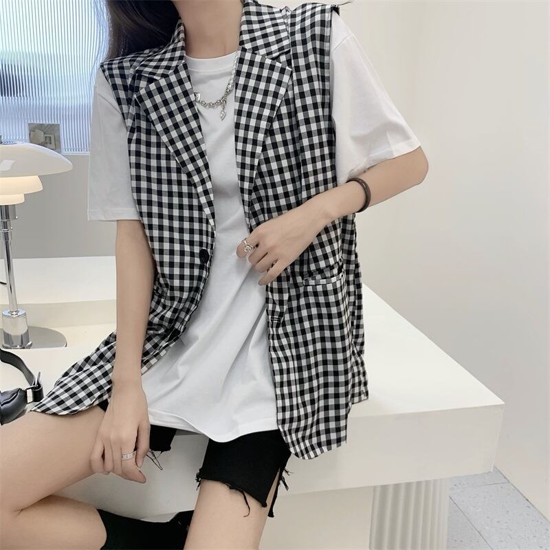 スタンダードブラックホワイトサマースリムノースリーブジャケット ルーズ レトロ 夏物 Xiaofeijia82739717324
