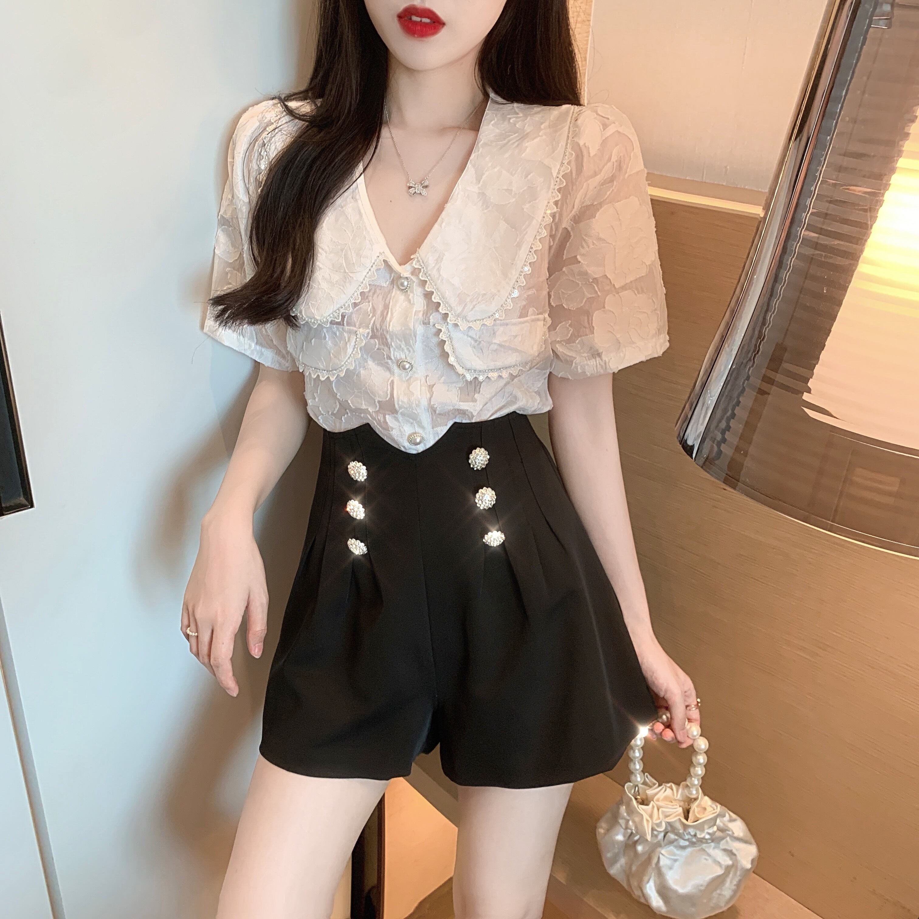 カラースリーブサマーレースパールバックル刺繍ブラウス シャツ 夏物 真珠 Xiaofeijia16142576560